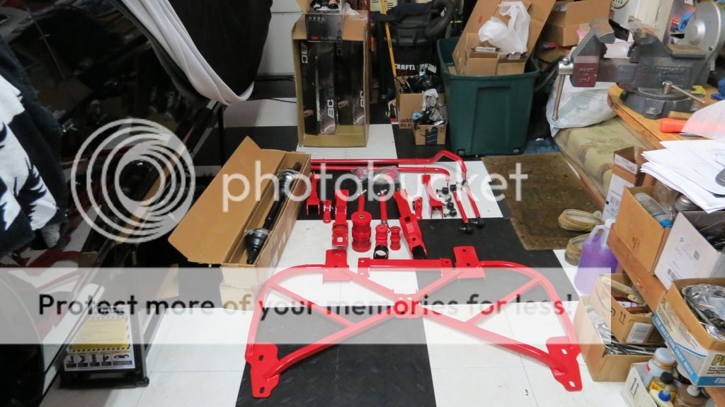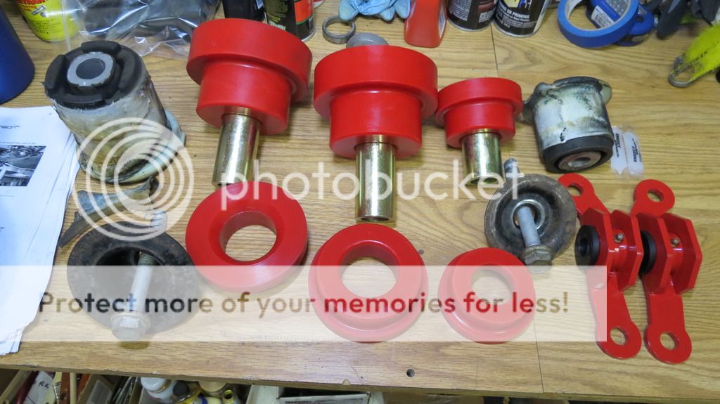 The actual replacement of the Bushings was around 6 hours, but I take my time and am in no rush. A key point I learned is you are NOT gonna push these bushings in by hand - they are too tight. So make a tool out of threaded rod, washers, and 1" sockets like I did. Install the top hat first, then the bottom, THEN the metal insert. The bigger project was the total suspension tear down, documented in my member car journal. This took "days" for the front, and more "days" for the rear. Time to clean and paint parts to be reused, install all of the bushings, and reassemble.