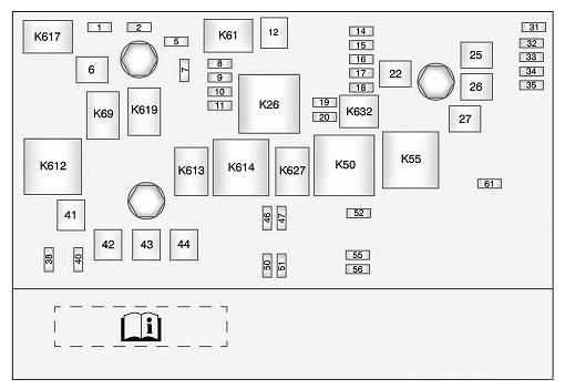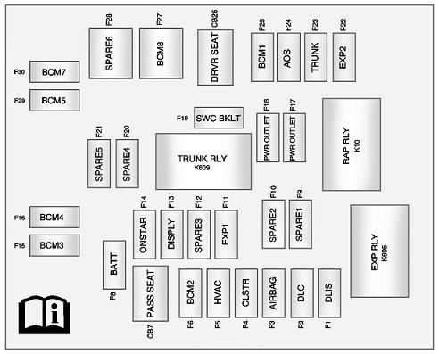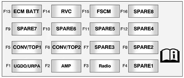 J-Case Fuses Usage Fuse 6 Wiper Fuse 12 Starter Fuse 22 Brake Vacuum Pump Fuse 25 Power Windows Rear Fuse 26 Power Windows Front Fuse 27 Rear Defog Fuse 41 Cooling Fan High Fuse 42 Front Heater, Ventilation and Air Conditioning Fuse 43 Antilock Brake System Pump Fuse 44 Cooling Fan Low Mini Fuses Usage Fuse 1 Air Conditioning Compressor Clutch Fuse 2 Transmission Control Module Fuse 5 Engine Control Module Main Fuse 7 Pre-Catalytic Converter Oxygen Sensor Fuse 8 Post-Catalytic Converter Oxygen Sensor Fuse 9 Fuel Injectors - Even Fuse 10 Fuel Injectors - Odd Fuse 11 Cooling Fan Relay Fuse 14 Manifold Air Flow/Chassis Control Fuse 15 Ignition Fuse 16 Run/Crank IP Fuse 17 Sensing Diagnostic Module/Ignition Fuse 18 Run/Crank Body Fuse 19 Transmission Control Module/Ignition Fuse 20 Engine Control Module/Ignition Fuse 31 Outside Rear View Mirror Fuse 32 Canister Vent Solenoid Fuse 33 Body Control Module #6 Fuse 34 Sunroof Fuse 35 Front Heated Seats Fuse 38 Washer Pump Front Fuse 40 Antilock Brake System Valves Fuse 46 HID Headlamp - Left Front Fuse 47 HID Headlamp - Right Front Fuse 50 Fog Lamps Fuse 51 Horn Fuse 52 Spare Fuse 55 High Beam Headlamp - Right Front Fuse 56 High Beam Headlamp -Left Front Fuse 61 Heated Mirror Mini Relays Usage Relay K26 Powertrain Relay K50 Run / Crank Relay K55 Rear Defog Relay K612 Cooling Fan High Relay K614 Cooling Fan Control Micro Relays Usage Relay K61 Starter Relay K69 Wiper Control Relay K613 Cooling Fan Low Relay K617 Air Conditioning Compressor Clutch Relay K619 Wiper Speed Relay K627 High Intensity Discharge Headlamps Relay K632 Brake Vacuum Pump Fuses Usage F1 Discrete Logic Ignition Switch F2 Diagnostic Link Connector F3 Airbag F4 Cluster F5 Heating Ventilation Air Conditioning Controller F6 Body Control Module F8 Battery F9 Spare F10 Spare F11 Not Used F12 Spare F13 Display F14 OnStar® Universal Hands Free Phone F15 Body Control Module 3 F16 Body Control Module 4 F17 Power Outlet 1 F18 Power Outlet 2 F19 Steering Wheel Controls Backlight F20 Spare F21 Spare F22 Not Used F23 Trunk F24 Automatic Occupant Sensing F25 Body Control Module 1 F27 Body Control Module 8 F28 Spare F29 Body Control Module 5 F30 Body Control Module 7 Circuit Breakers Usage CB7 Passenger Seat CB26 Driver Seat Relays Usage K10 Retained Accessory Power K605 Not Used K609 Trunk Fuses Usage F1 Universal Garage Door Opener/Ultra-sonic Reverse Parking Aid F2 Amplifier F3 Radio F4 Spare F5 Convertible Top 1 F6 Convertible Top 2 F7 Spare F8 Spare F9 Spare F10 Spare F11 Spare F12 Spare F13 Engine Control Module/Battery F14 Regulated Voltage Control F15 Fuel System Control Module F16 Spare |
