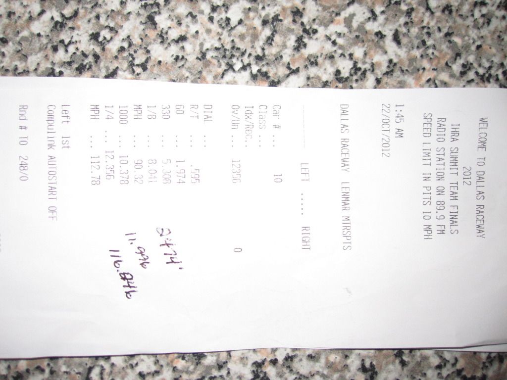 Ok guys - I am embarrassed to post but figured since I gain so much from your slips, and many here helping me - I need to show as well... My 60's suck - and this is the first time I've run this config on the 1/4 - tires / cam / and most of the adds but had a decent run (need to be lower 11's and will take high 10's on a fluke) ...