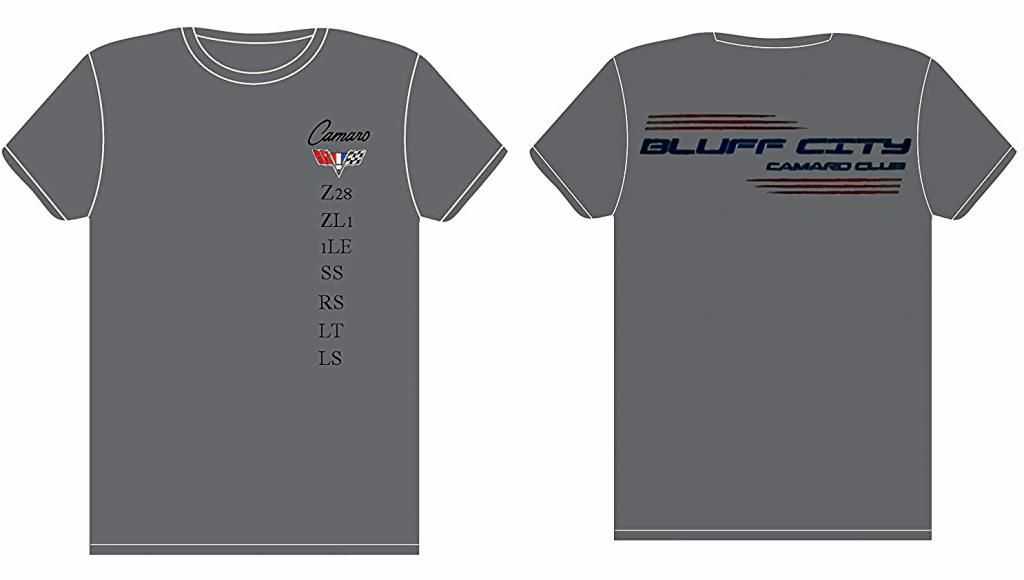 Sarah, could you possibly do a simple mock up with the BCCC multi-color logo on the back and either "Bluff City Camaro Club" spelled out in a similar font on the front (small -left pocket area). Or another option might be to possibly use the "Camaro" graphic that was on the back of the "Welcome to Memphis" shirts that were worn in Clarksville. I think that logo just said Bluff City Camaro Club with an outline of a C5 (Cooley's post #1293 - 6.22.14). What if we had that on the back of the shirt, and the multi-color Bluff City Camaro Club logo (business cards, Facebook) on the front left (small)? Does that make sense at all? LOL!