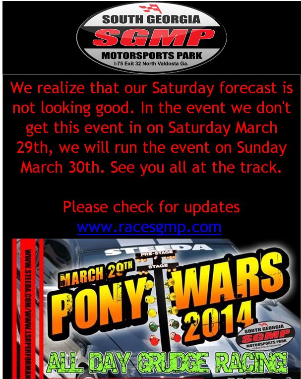 On track activities for Pony Wars is postponed till Sunday same time 9 a.m. as gates open.