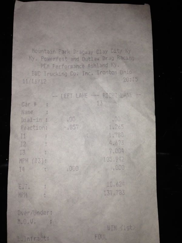 Fought a tranny that wouldn't lockup in third gear all day and headwind, but still managed to get closer to the #1 n/a time. Only change from prior mods is 1LE 3.90s. N/A. Also cut my first 1.4x 60 foot, but i have to find that slip. Car has another few tenths in it once I get lockup working and perhaps some mineshaft air