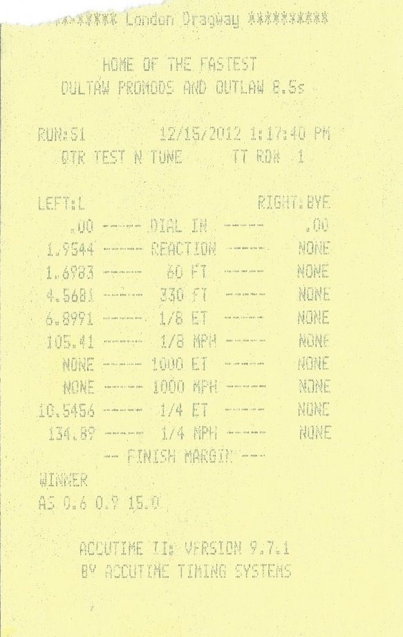 ![]() I'd spend the next few track visits working on the 1/8th. It's so critical. And your 1/8th, lets be honest, sucks. A 6.3xx will get you into the 9's. You just need some more seat time before anything can be truthfully stated. What have you been doing for the last 3 years!! I guess everyone can't get to the track every wk like some others.