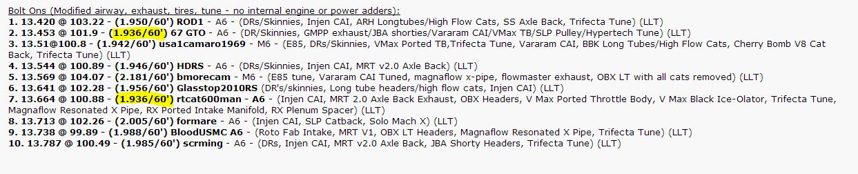 It just so happens I have the 60' times on a spreadsheet on my computer for the top ten bolt-on list. I will post a picture of it below. (by the way I just noticed that I have that information on the top ten list too -- post # 3) picture below too.