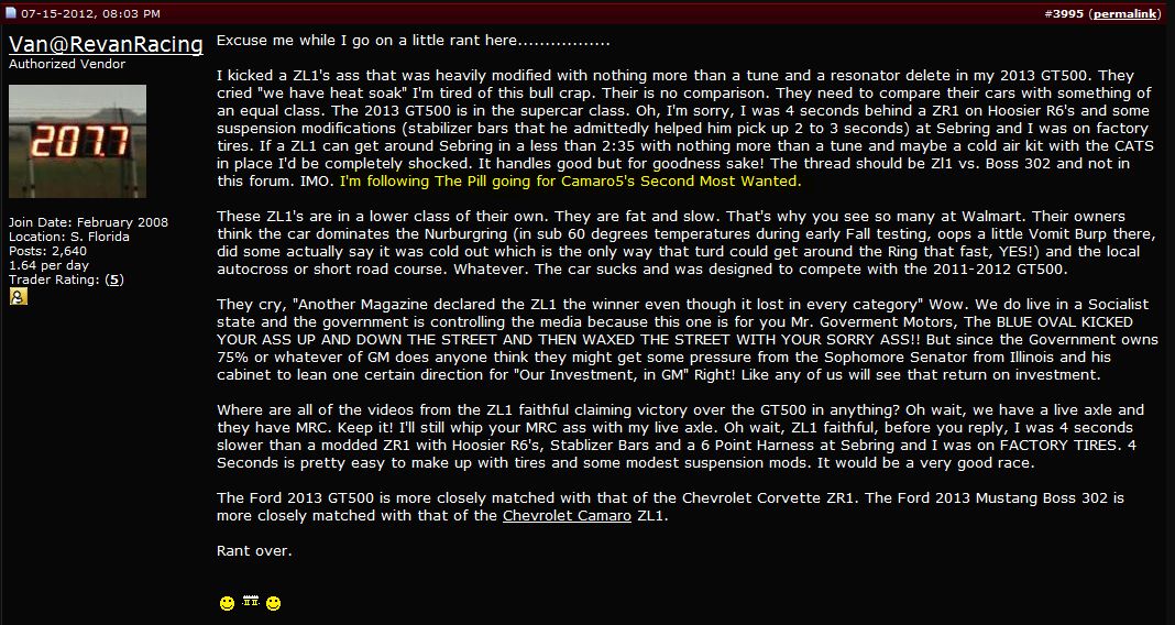 There appear to be some Ford fans that don't like the fact that the first four magazines that compared and reviewed the 2013 GT500 and the ZL1 all chose the ZL1 as the better vehicle.
