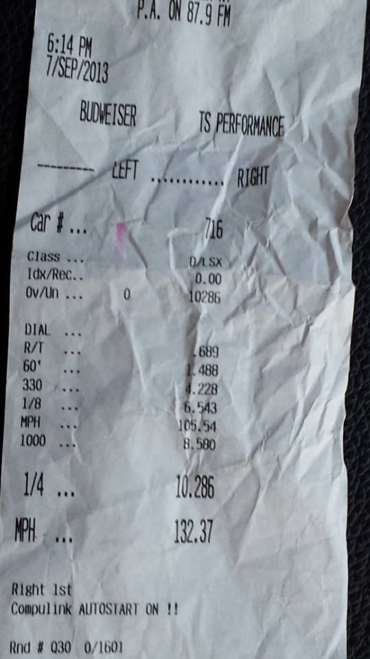 10.76@130.5 1.67 60' LG headers and exhaust, 3200 Yank, EPS Cam, D1SC Procharger, all work performed by Blanchard Performance |