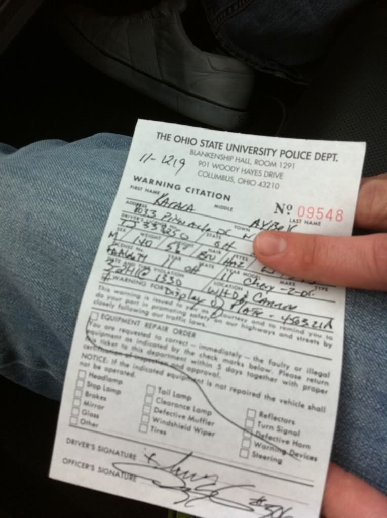 I've been pulled over for a front license plate at OSU but got off with a warning
