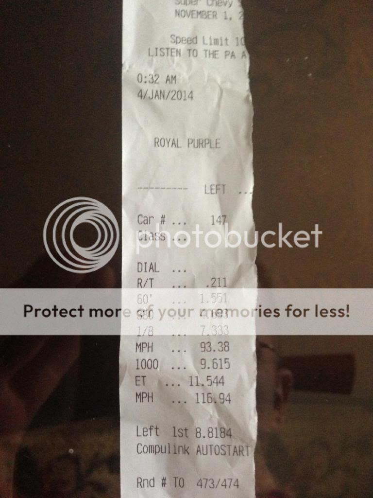 I'll put you on the #3 list for the 1/4, but the numbers to the 1/8 can't be accurate. So to post to the 60' or 1/8 mile list I need to a more current time slip to back those numbers up.