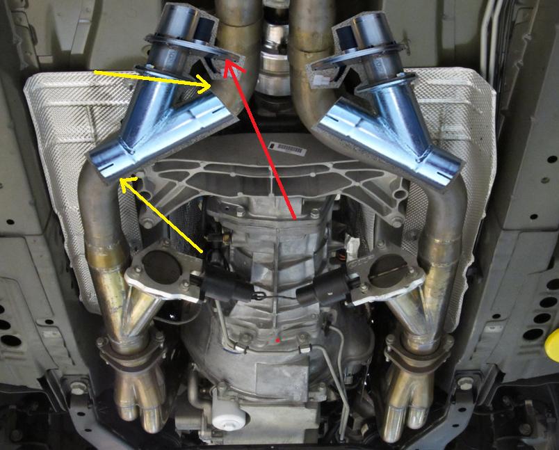 And the shop varified what I found out yesterday. With Borla exhaust you aren't going to cut out and clamp in a Y diverter. Gonna have to be welded either way. he said 80.00 and he'll do it but I have to have the butterfly type. FTR, they could fit on one spot. But it would leave them visible by the mufflers. I decided that would look like shit and draw attention to any would be DOT Troopers who knew what they were. In the below pic I'm holding it up where it would be welded on. I could turn it the other way but it would shoot straight at the tires about 4 inches away. Even with a few turnouts I didn't feel good about it. |