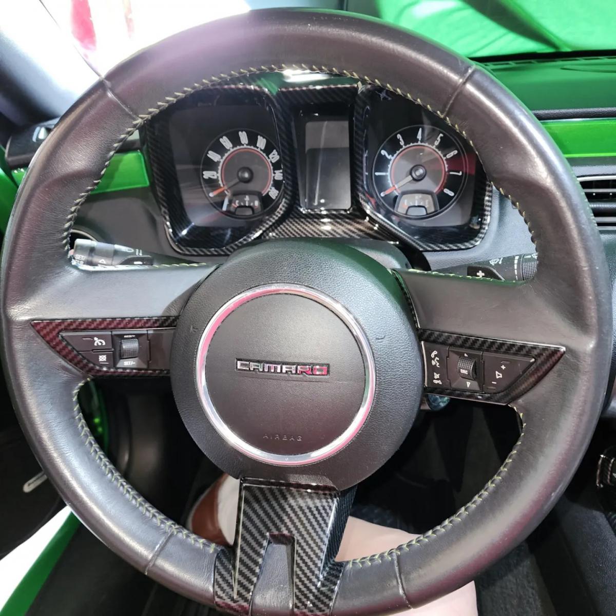 Looking good! You didn't do the center piece for the wheel?? I just got done doing mine in the red CF. As soon as I can get some pics I'll post them. Also did the gear shift "PRNDL" console cover in the red CF, blends in nicely with the black CF I have already. Just waiting for the radio/AC face kit to come out in the red.