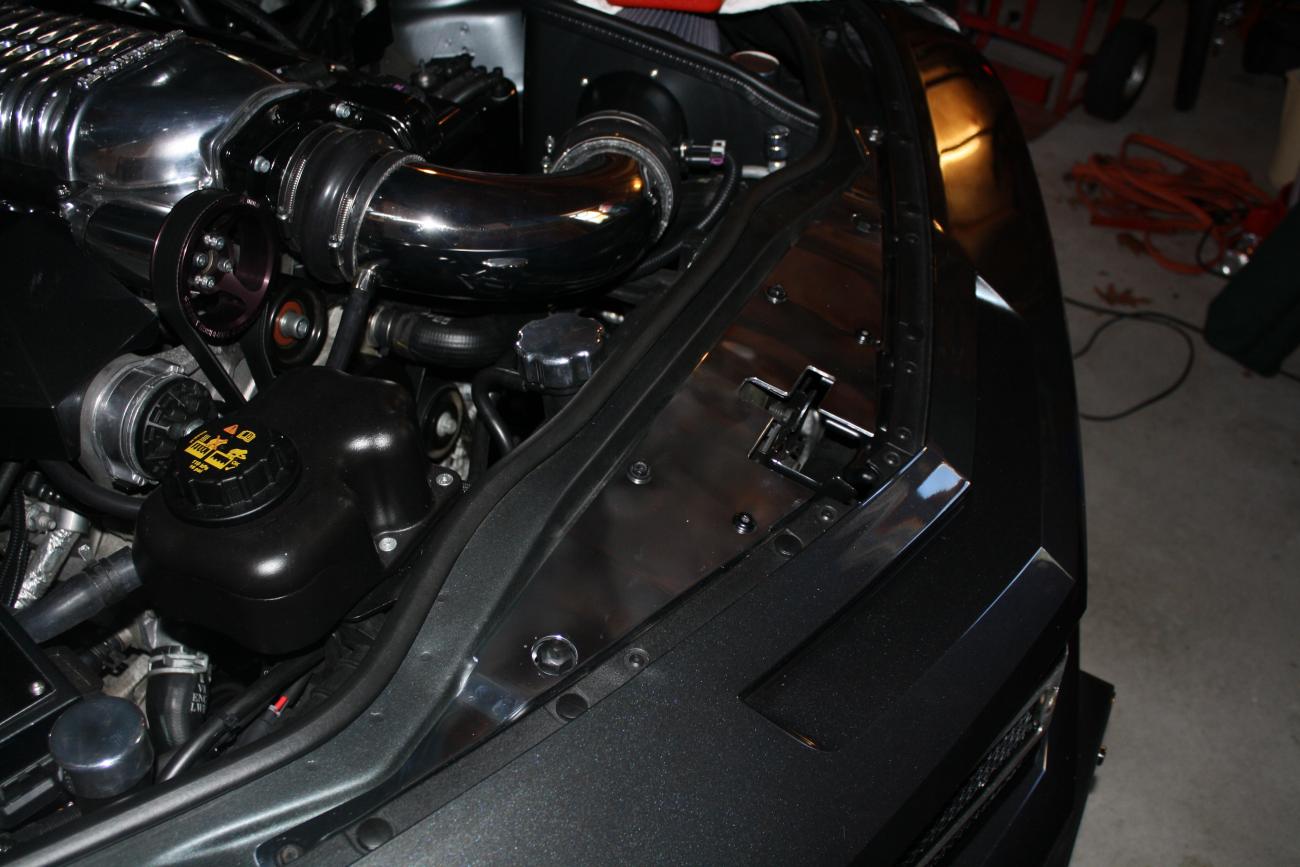 Seems like winter will never end, can't wait for the nice weather up here in the northeast. So this past weekend was actually "warm" in the 50's so I hit the last set of mod's before the Camaro is off to the body shop. First was a chromed front center inner fender panel (sorry, the lighting in my garage isn't very good)