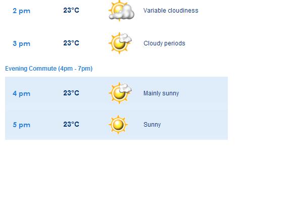 12:00-2:00 Isolated showers 2:00-4:00 Chance of thundershowers (I should note that during that range they call for cloudy w/ sunner periods) 4:00-6:00 Cloudy periods 6:00-9:00 Sunny Unless the forecast takes a dump tomorrow - I'll be there by 5:30 PM COMMON PEOPLE - LET'S MAKE A STRONG SHOWING!!!!!