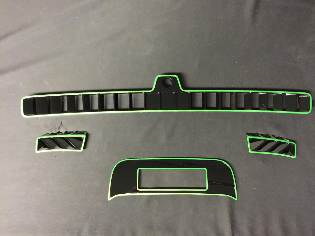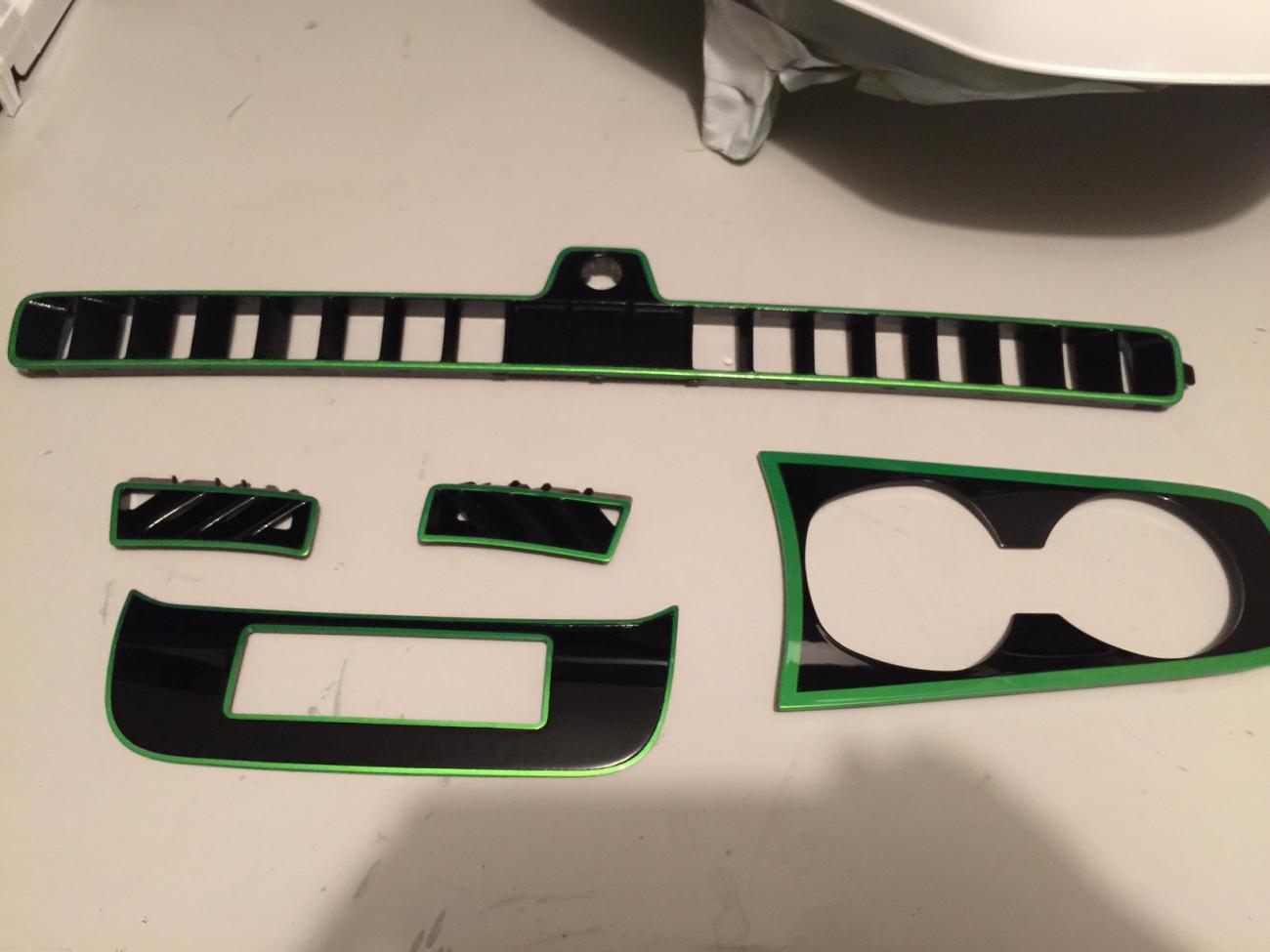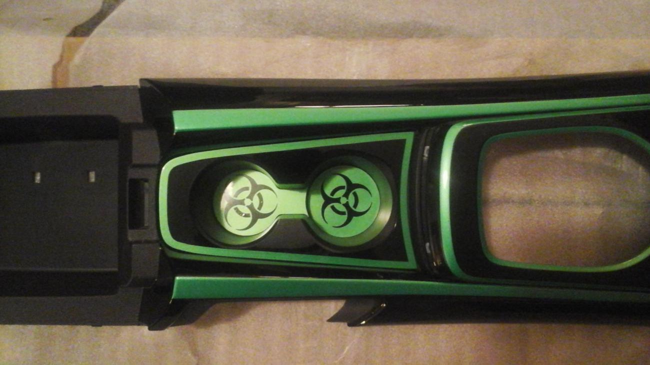 New Cup Bezel , painted, Gloss Black with Synergy Green stripes . New Cup Holder Inserts , painted , Synergy Green Defroster Vents, 3 pc. for dash , painted ,Gloss Black & striped in Synergy Green. More stuff to get done on the car....lol Got pics of my ACS Hood Liner , Air Brushed. The Walking Dead.. I think it looks SICK.... ...Hard to get real perfect pics with the reflection. But that means it's clear coated like hell.. LMK what you think ..It's going to look great with the theme and the car...