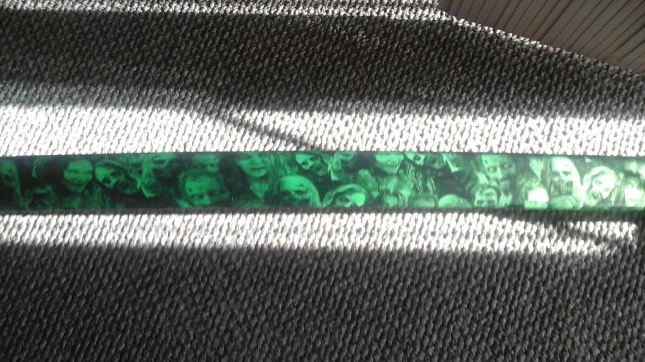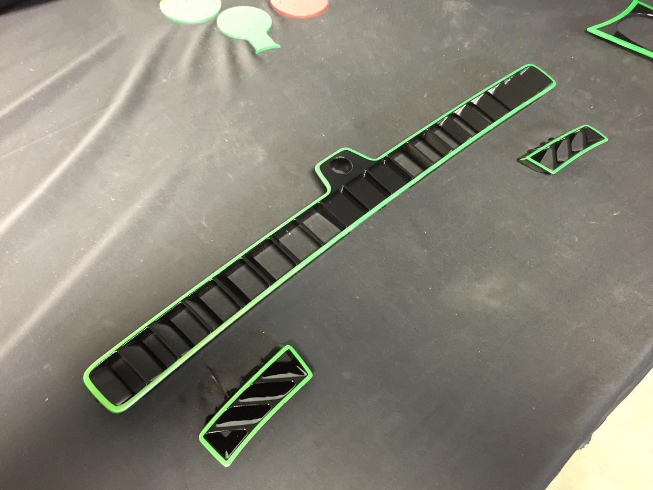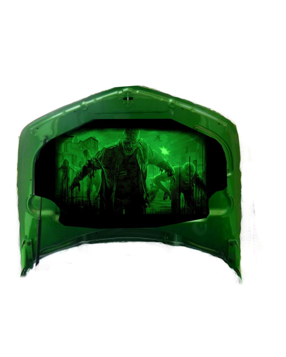 New Cup Bezel , painted, Gloss Black with Synergy Green stripes . New Cup Holder Inserts , painted , Synergy Green Defroster Vents, 3 pc. for dash , painted ,Gloss Black & striped in Synergy Green. More stuff to get done on the car....lol Got pics of my ACS Hood Liner , Air Brushed. The Walking Dead.. I think it looks SICK.... ...Hard to get real perfect pics with the reflection. But that means it's clear coated like hell.. LMK what you think ..It's going to look great with the theme and the car...