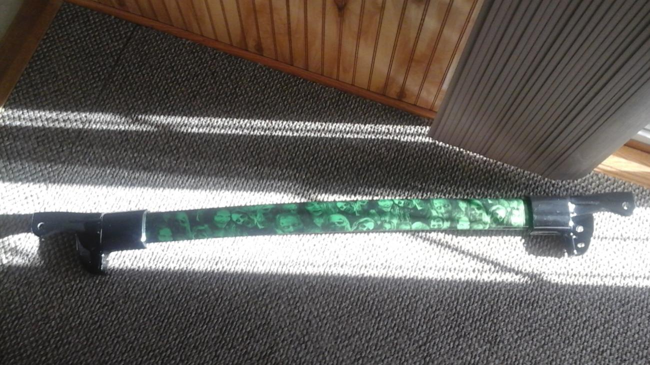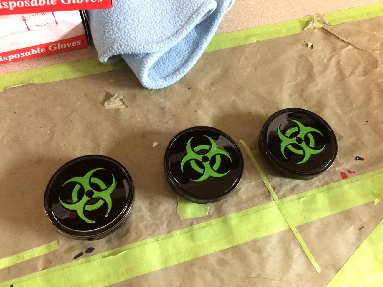 On the bright side ordered my new Cover King seat covers for the front seats. Min are pretty faded after 4 summers. I wasn't going to buy these again. But after trying 3 shops for redoing them with green leather or vinyl and no luck . It was just cheaper & easier to buy them again. Well after five more places I checked ,no luck on finding black chrome allen bolts. So what I did find is the exact Sam's size that I have , M8 1.25 16 mm thread. The heads are a pinch bigger and they are black machine bolts. , so they will rust in time. So what I'm going to try is either spray painting the heads black & put a few coats of clear on . Or just clear cost the heads because they are Black already. The only reason I'm trying it they were pretty cheap if it doesn't work out. I got 100 of the for $13.00. Didn't think I had much to lose. Actually they should be good to paint black because they are ruffled up already. Got my new Hydro dipped Strut Tower Brace back today . Turned out really sweet looking. . Also got new Bio Hazard symbols for my cup bezel inserts.I think they look killer.