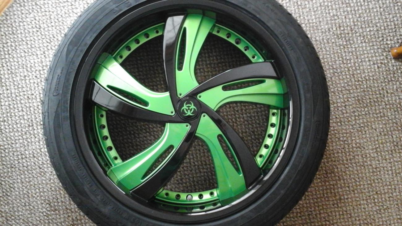 ![]() Status Fantasy wheels 20s X 8.5 all 4 corners , Black with chrome inserts .I going to have the Chrome inserts painted Synergy Green & the center caps painted black with Green Bio Hazard symbol painted on them . Putting General G Max AST 245/45ZR20 tires on them . J I think it was the best set and price got all 4 wheels , Tires , sensors , mounted ,balanced & shipped for $ 1,790 http://www.camaro5.com/forums/attach...9&d=1420134420 New Wheels arrived today , they are amazing. They look so sweet .Inserts & center caps off to get painted. Can't wait to see them all done & on the car. Winter needs to be over... __________________