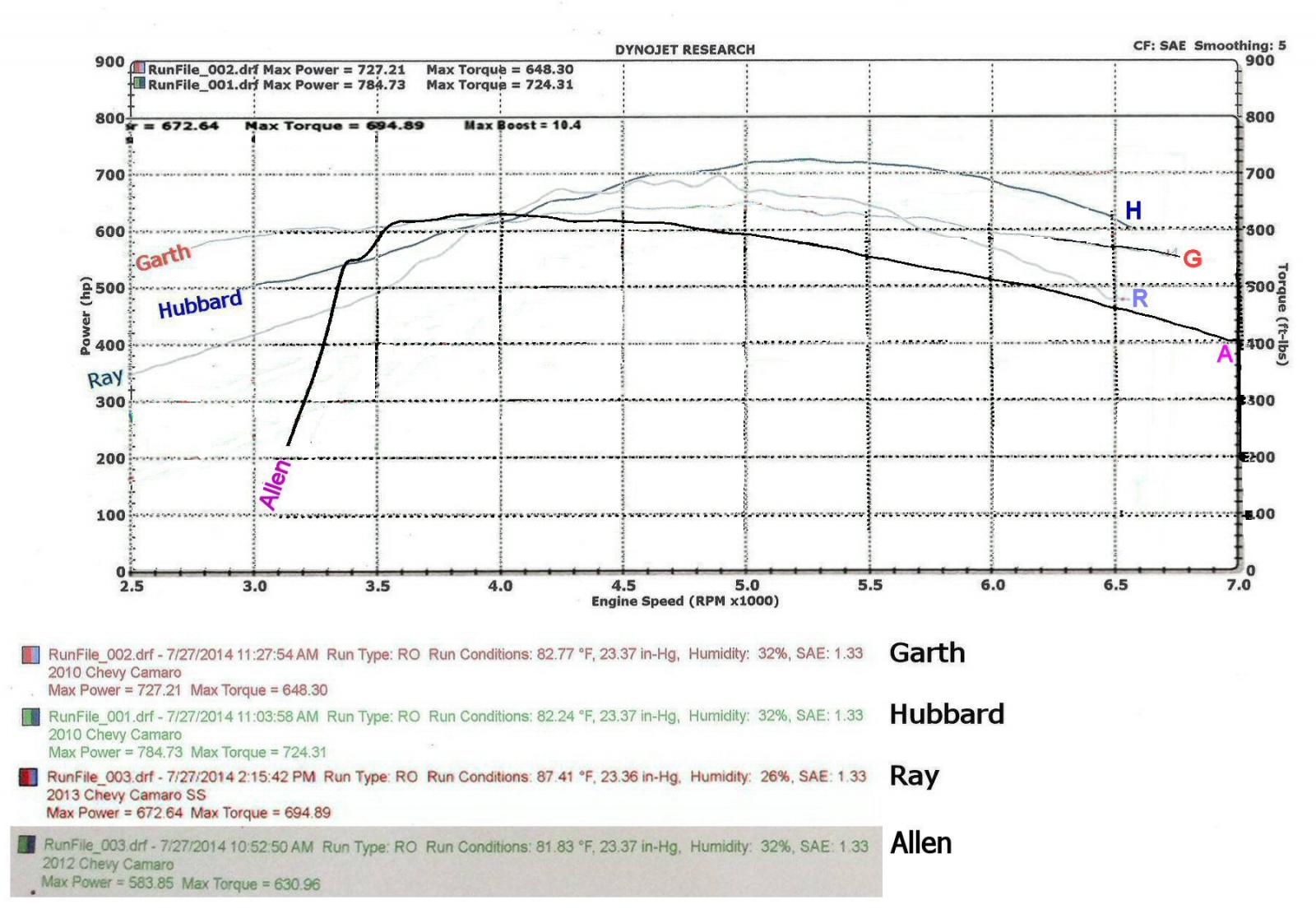 Garth has a roots [forged LS3, heads, 16psi] Hubbard has a centri [SBE LS3, D1, 15psi] Ray has twins [SBE LS3, head work, 10psi] Allen has nitrous [SBE LS3, 200 shot] The top graph is horsepower - as we'd expect, the centri produces more power as RPMs climb The bottom is torque: - as we'd all expect, roots and nitrous produce tons of bottom-end torque - as turbos spool up, so does the torque My believe is the more area beneath the curve (power band 4,500 to 6,500RPMs) during a race is going to win.