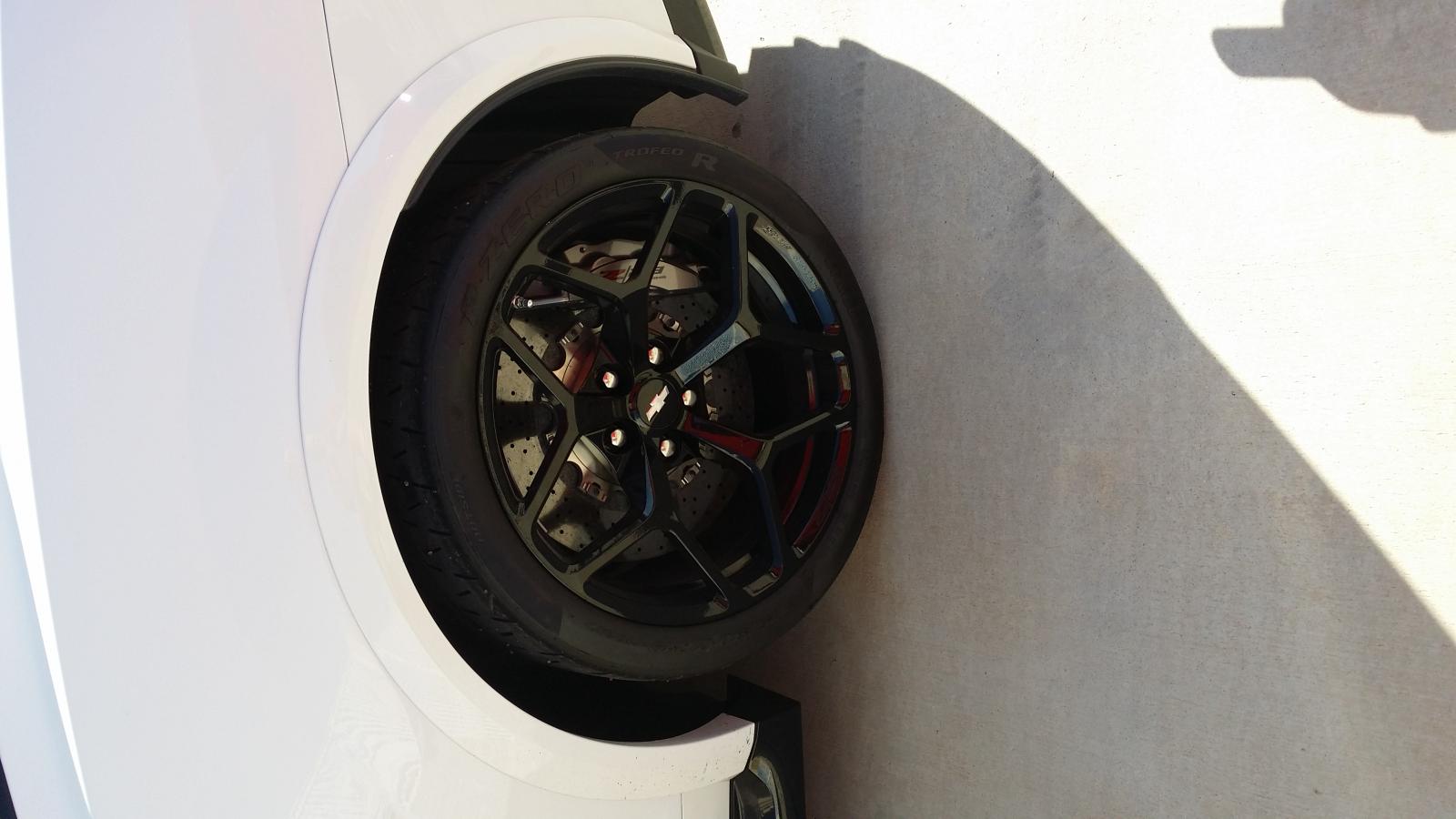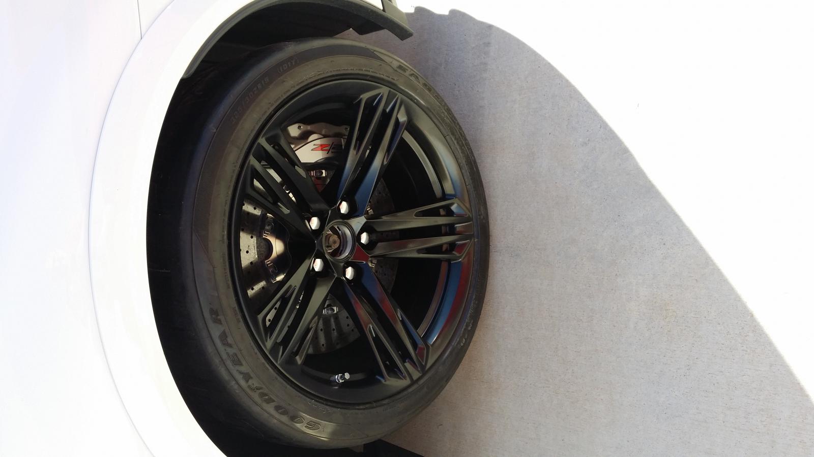 So I have 5 pics for you, first 2 are the stock Z/28 rims and tires on the car in the rear only, next are the stock rear ZL1 1LE rims and tires, as you can see they fit and don't stick out much more, but they hit the plastic wheel well but only at the center part of the rim, but if you wanted to get an extra set of wheel wells and trim them you can run the rimes with out spacers, or run some 3-5 mm spacers and your good IMO.