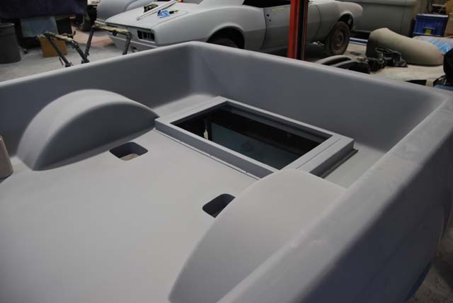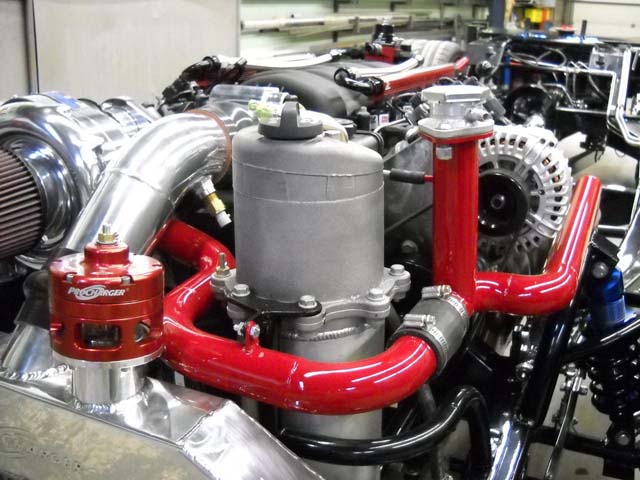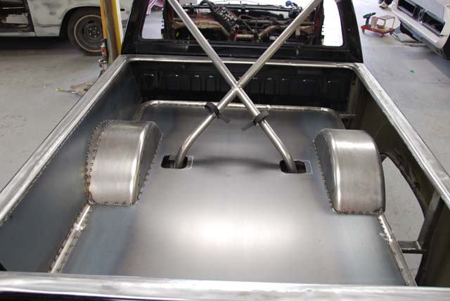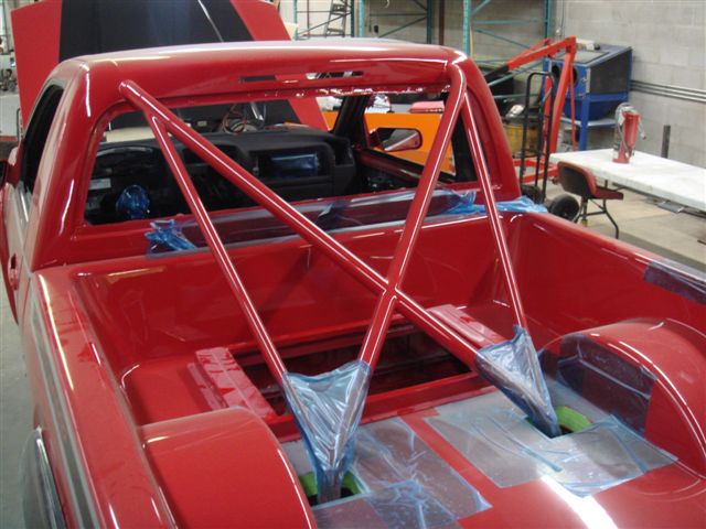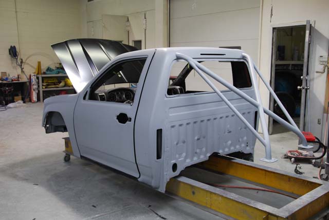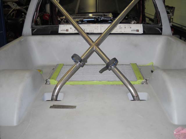 As well some shots of the body all primed and ready for paint. you can see by the pics that the rad definately wouldn't fit in the front so the guys did this trick rear set up...we are matching all the piping with the color of the truck as well.