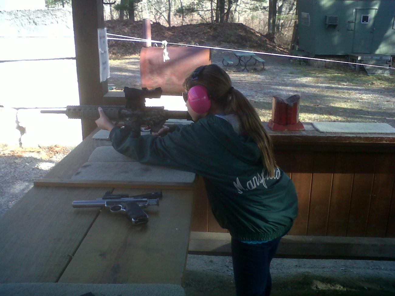 Here she is shooting a S&W M&P 22 with a red dot sight