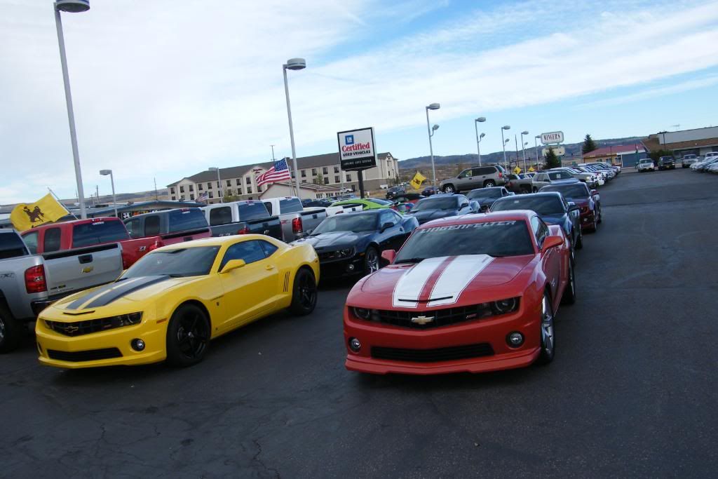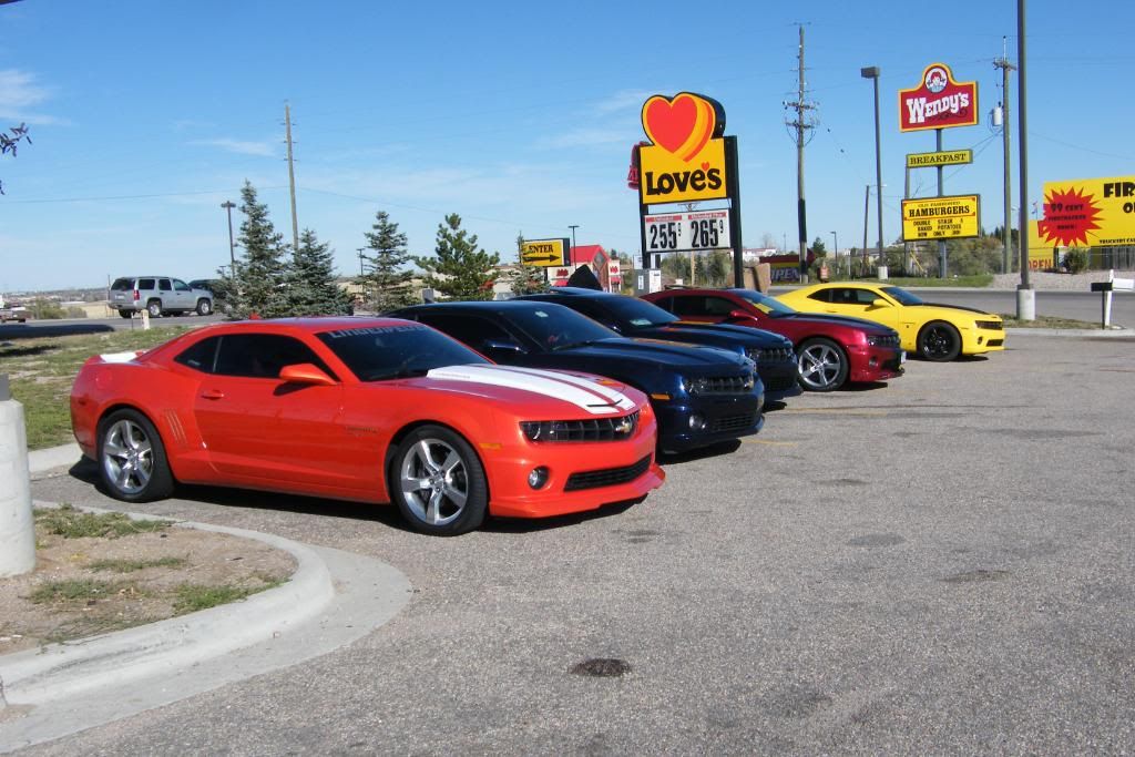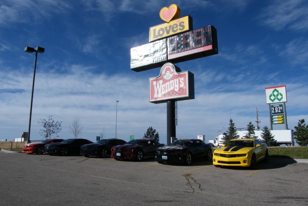What a great Camaro Day yesterday. As Derek and Scott converged on the MickyD's in Longmont Larry and Garth also rolled to meet up with them. To our surprise Cheri also was with Garth. Whooooohoooooo! Our mission for the day was to get Ted up to pick up the panty dropper. Thats the new name of Ted's car by the way. Wonder if he will get custom plates? So after a few minutes of discussion and Garth filling his belly with a cheeseburger and coke we were off. Of course we all had to rev em up under the over pass to echo off the walls. To bad there was not a tunnel on this trip. Onto the highway we went. On Ramp = pure fun. About the only spot you can totally just let it open up this time of year. We all dashed onto the freeway with Derek saying something about 130 mph...Not sure about that but then again you never know. Driving in somewhat light traffic, listening to favorite music and being in the Camaro was great joy. Four in a row....whooosh whooosh whooosh and whooosh....folks were enjoying the unusual show of Chevrolet power and charm. Pullled off the highway at exit for Ault and hiway 14. Around a corner and onto the frontage road to Teds. A few nice corners to play on and about a mile of no traffic straightaway to play on. As you might think this opportunity was not one to let pass by. As we came around the corner into Teds subdivision...he was standing in the front yard. Before even coming to a complete stop he was opening the door and trying to hop in....I think he was really wanting to get to Laramie fast. Garth and I were told to not hurry so Brian would have a chance to finish the panty dropper. So we all just got out and stretched our legs. Razzed Ted a bit and reliived the drive up. Scott was grinning from ear to ear..I think he had been drinking all day since it was his birthday. No serioiusly he was just loving the camaro life and telling stories like he had been doing it all his life. His daughter was with him and would just roller her eyes at him. bahahahaha. Finally Ted coaxed us all into our cars again and off we went. Next stop Cheyenne Loves Truck stop for fuel, more food, more talk, and Andy, Pepper and Chris. Driving to Wyoming was very calm as I was driving lead car. And knew this area is prone to speed checks....end of the month...Holiday....no reason to be stupid was there. Ted and I had a great time going up. At one point I said I bet they are wondering why we were wandering all over the road. Bet they think we are looking at titty pictures on Ted's phone or something. Ted just laughed and said he would put them away...jk Actually, we were looking at car parts and remembering the build and the highs and lows along the way. Into the Loves we drove. 4 cars pulled into the pumps to top off like a yellow flag at a nascar race. Rumbling in next to pumps, out and fill, ladies run to the rest room etc etc. Man it was cold in Wyoming by the way....Glad we got a state line to keep that shit north of the border. After fuel we pulled around and found a nice parking area..Did our best job of spacing and parked the beasts as we all dashed into the Wendy's for some more snacks and talk. Scott had to sit in just the right spot to keep an eye on his new car. He still has the parking lot paranoid gremlins in his head...Boy I remember those days well. We ate like we parked. Scattered all over 4 different tables Fries, frosties, burgers and assorted others including a baked potatoe that Ted was devouring. I think he was still in a hurry by the way. And pulls in and parks next to the gang of Camaro's and takes a few pics. Pepper calls in that she just drove by at a high rate of speed and would be right back with Black Bueaty. Chris got the message wrong and was waiting for us to call him as we left Ted's but had quickly driven across Happy Jack Road and was waiting for us roadside. Pepper arrived, we cleaned up our mess. Shopped in the Truck stop for a minute and finally we were off. Led by our Wyoming hosts Andy and Pepper we were guided down to the exit for the Happy Jack Road. Happy Jack is a alternate to I 80 that heads from Cheyenne to Laramie. Two lanes for the most part. No Semi traffic and is much more scenic than the steril highway. Well I guess we made Andy nervous and he did not want to hold anyone up so he ran the tour at a pretty good clip. Very very nice road. Smooth and curved ample passing room and light traffic. Seemed much faster than I80 and the journey was over way faster than anyone wanted except Ted. Right as we got to Laramie my phone rang. It was Garth. He wanted us to check out his half shafts for vibration. Well finally I was able to position my car behind his and Ted and I strained to look under his car....Impossible I said to Ted. Garths car lowered and driving there was no way would could see anything. We checked his wheels for wobble but they looked good. I think the vibration he was feeling might have been the micky d's and wendy's he had eaten in the last hours. Pulled into the Laramie GM auto Center and parked pretty much like we did at the show. 7 Camaros right out front. As we entered the building service bay the first think we saw was Ted's car was not in the shop. One last chance to tease Ted. We all hollered for Brian to start work on it. Ted was grinning so big at this point knowing the posession he has been without for the last two months was finally done. A little small talk and it was time for business. Ted turned it over. Panty Dropper responded with a quick and effortless roar. By now Ted's face was swollen and red from grinning. I would have liked to see him on Christmas mornings..Oh on a side note. He started getting text messages from his GF warning him on his driving and to be careful. Finally she called him and gave him a verbal scolding. he reassured her that he would not be going over 15 mph the whole way home as he had to break in the new parts. Obviously she did not believe him as she immediately texted back again...."Thompson....