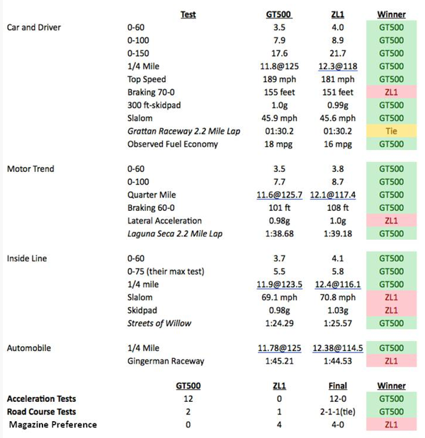 Amazing how balanced both of these cars are. Personally I can see the most extreme modding enthusiasts, people who only want to drag race, true racers as they can consistently put out amazing times, and people who only care about numbers (generally not enthusiast, but rather show offs, these guys will trade when the next biggest and baddest thing come out) and of course die-hard Ford guys choosing the GT500, while the ZL1 attracts to people who want something more liveable, yet still amazing at the track with better and more consistent handling, and of course the die-hard Chevy guys. I may be biased, but I think the ZL1 looks better too
