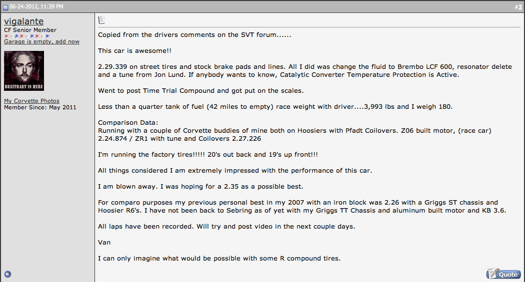 Here's comments from driver from Raven Racing driving Sebring Raceway with better dot brake fluid and stock tires. His time was 2:29. Erik
