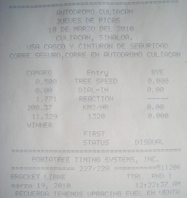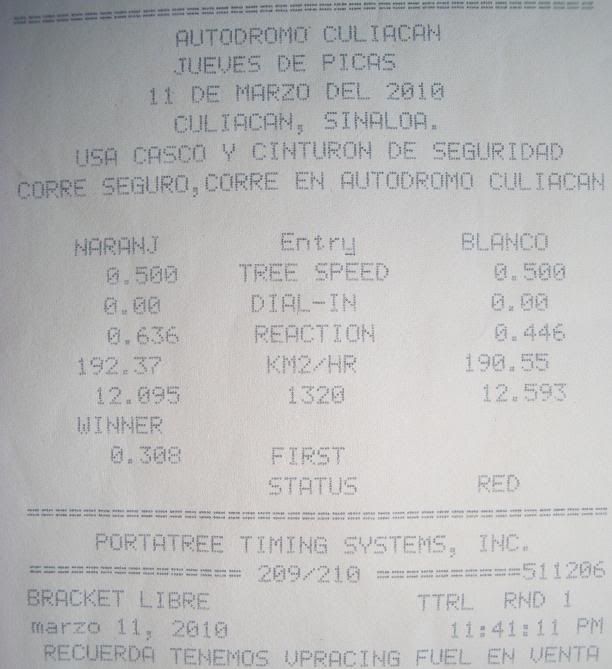 Top Ten Class: Power Adders Tires used on the pass: Nitto NT05R on 20" wheels Performance Mods: Nitrous/200 shot, Engine/Heads/Cam, LTH, Exhaust, CAI, Converter, Tune. R/T:............. 1.771 60':.............. ?.??? 330':............ ?.??? 660':............ ?.??? 660’ mph:.... ??.??? 1000'........... ?.??? 1320'......... 11.329 1320’ kph.. 208.370 (129.48 mph) Name/Location of the track: Autodromo Culiacan Date of pass: 3/18/2010 Weather conditions: Cool Tranny does not like the juice. ![]() I'm on the left: ![]() Video here: