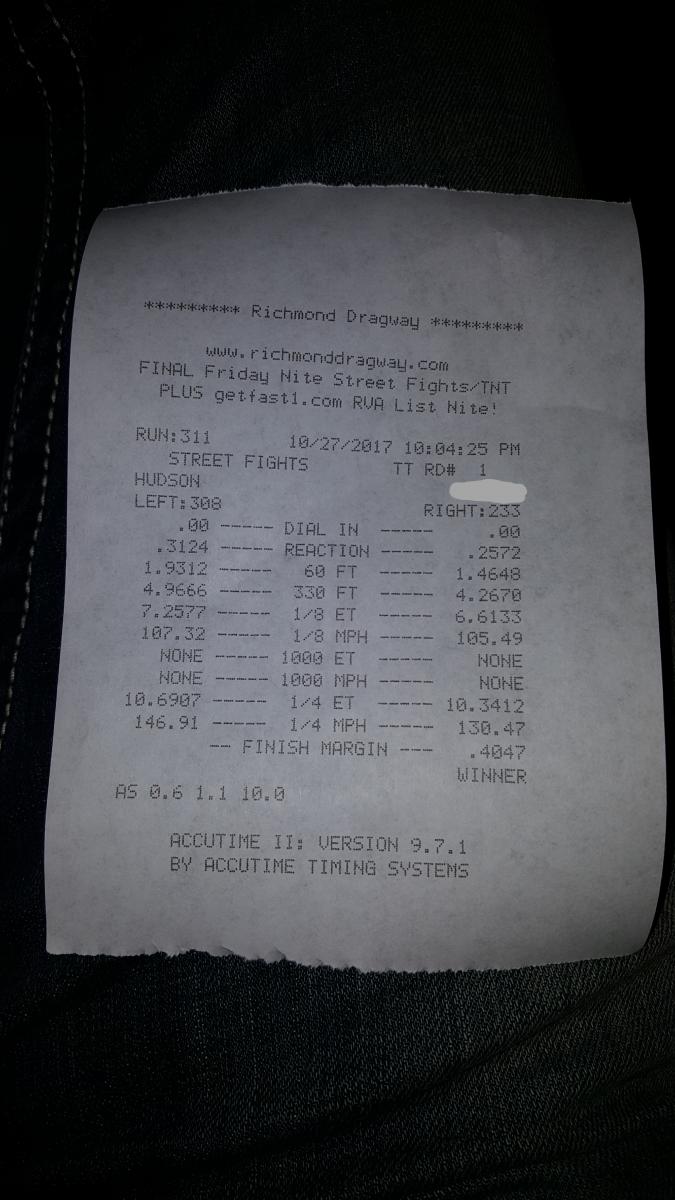 L99, A6 Tires used on the pass: 325/45/17 M&H Race Master Drag Radials Performance Mods (if any): Build Thread in Sig - Cam, LSA Blower, 93 octane only, 11.5lbs boost, Kooks Headers, GMPP LS3 PP Heads, Yank Converter, ZL1 Rear, Pedders Supercar Coilovers, Weld 17x5 - 17x10 Category submitted for: #6 R/T.......... .2572 :( 60'............. 1.4648 330'........... 4.2670 660'........... 6.6133 660’ mph... 105.49 1000'.......... N/A 1320'.......... 10.3412 1320’ mph… 130.47 Name of the track: Richmond Dragway Date of pass: 10/27/17 Weather conditions: (include Density Altitude, if known): between 50-55 degrees, nice weather. DA unknown PS. This FI Coyote learned the hard way what QUICRNU meant