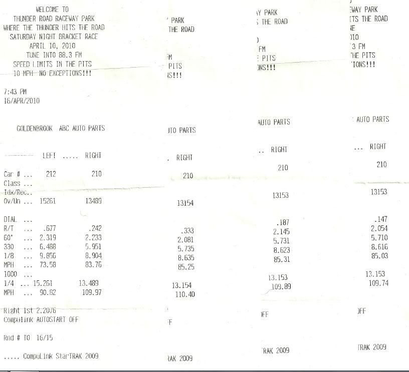 Thunder Road Raceway Park Gilliam, LA Elevation: 210' Air Temp: 64* Barometric Pressure: 30.06 Density Altitude: 550' Mods: Muffler delete, V6 brake swap. ![]() In Car |