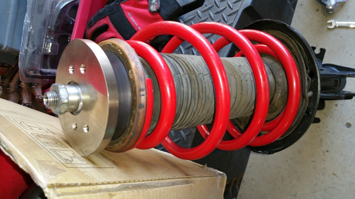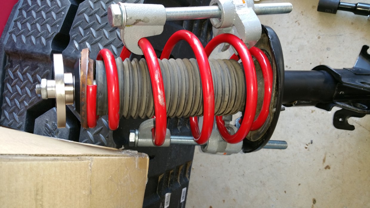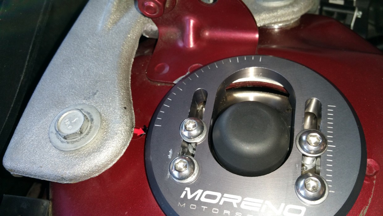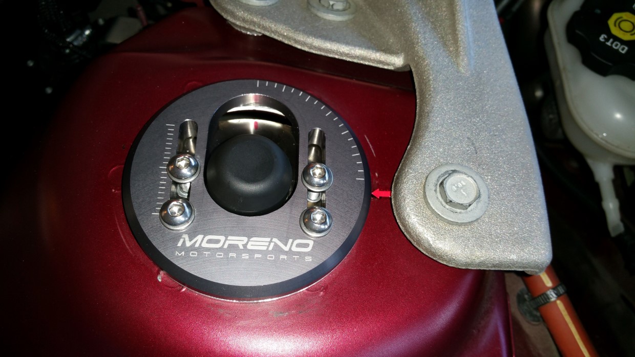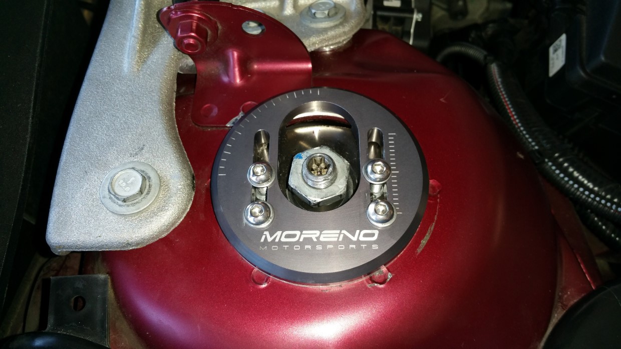 Just so everyone knows, I have a late model 11 and after a call to Justin, we both realized I needed to follow the '12' instructions as the late model 11's were upgraded. So, taking off the struts are no problem (I've done it a few times on this one), but before you do that, take advantage of 2 things: 1) Mark the strut to the Knuckle with a marker and 2) Using the metric bolt, screw it in to 'mark' your current setting. This will make it MUCH easier to re-install and get it right: ![]() ![]() So, once you've followed the instructions, here is the 'black' top: ![]() and the spring retainer you need to separate: ![]() ![]() Lower part of the Moreno installed: ![]() ![]() Now installed on the strut: ![]() ![]() ![]() So to install the 'top' on the passenger's side on the late 2011, here is the spacer you'll need: ![]() Installed! ![]() ![]() ![]() ![]() Now, the vinyl arrows don't stick well. I adjusted them and then used super glue to 'clear coat' it to stay. I did clean the area first and then applied the arrows... Now, I did tighten the top camber plates, but when I 'moved' the car, the left strut 'slipped' so I had to adjust again and made sure it 'settled' properly. Tighten up and off I went -- no issues! All done! ![]() More to come... -Don