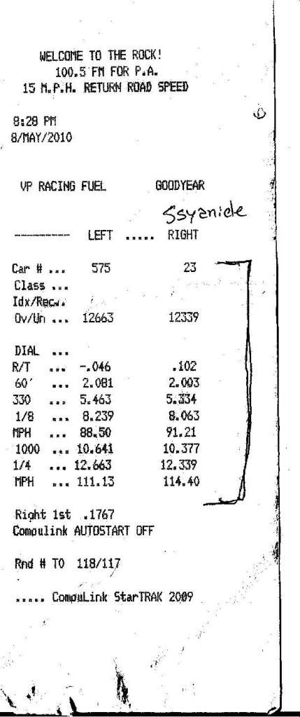 As for the top guys not going to the event, I resent the fact that you say we were "dodging" the event. I wanted nothing more than to show up but was unable to do so because of work. I'm pretty sure nhra stocker was there and ran a sub 13.00 second run. Maybe you missed that one.