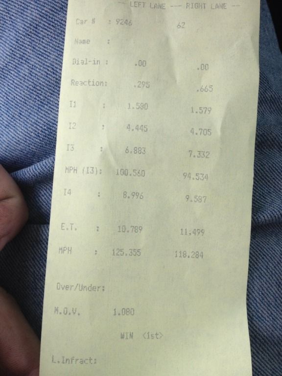 I did get a pretty good 60' at 1.57 but the car threw 2 codes during the run so I am dissapointed with the overall outcome. Got both a Misfire code and IAT's running at 240 degrees. I didn't run anymore after this run as I figured it would be better to drive home than get a tow....