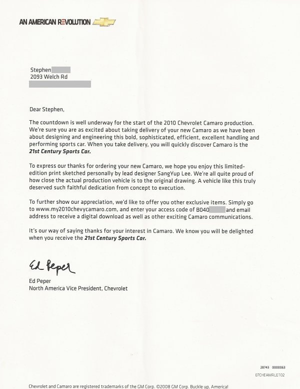 I'm happy for all of you who got your letters, but I am not that down as long as I get my Camaro 2SS/RS, who cares about a letter, but it would be nice to hang on a wall as a momento I guess.