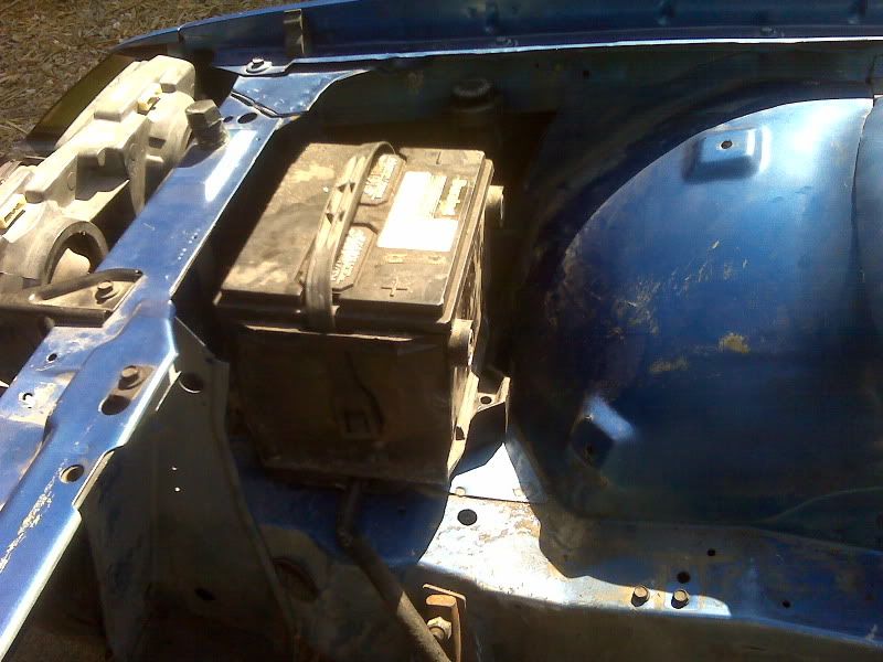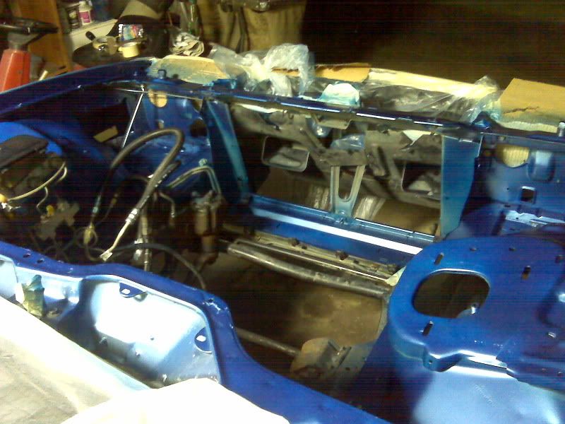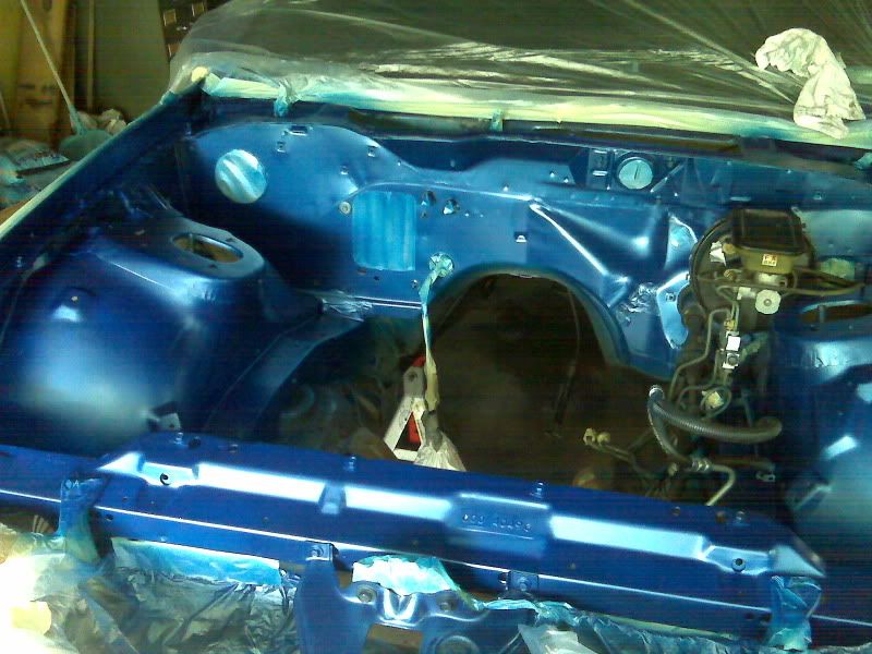 I made some more progress yesterday and today. I taped off most of the engine bay and put primer down on parts that had started to surface rust. I sprayed some blue in the bay, but ran out before I got it good and covered. So on Tuesday I'm going to have to buy another can of paint so I can finish it and then put clear coat over everything. I also need to take a rag and some thinner to the brake lines and booster as well as the fuel lines. It got way too complicated taping them off, and I really felt too lazy to remove them.