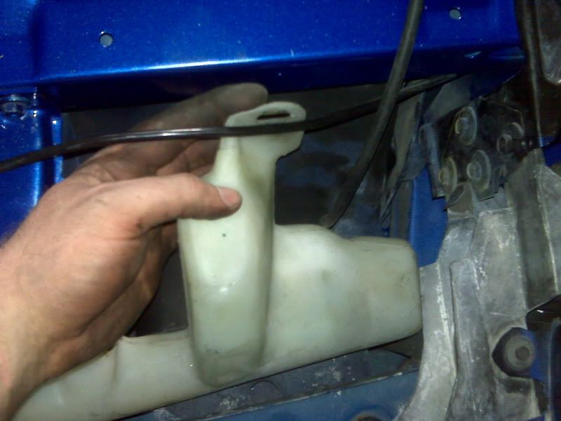 Anyways, I was really pleased with how clean the under side of the car was under all the road grime. The trans tunnel looks brand new! Keep in mind this car has 103,xxx miles on it, and has been driven in rain and snow. Even with that considered, the frame and floor panels look awesome, the only surface rust on the bottom of the car is where the sub frame connectors were welded on. ![]() ![]() Then after working on that for a little while and getting sick of laying on my back, I started working on the 4th gen windshield washer reservoir. It's not secured down yet, but I'll have it mounted tomorrow. It's just sitting in there right now because I was checking how well it fits, and it fits well! ![]() ![]() ![]() More of the reservoir install (you can't see it from my custom grill because I mounted it so high on the frame. I even got to keep the plastic "funnel" that directs air from the grill area to the radiator: ![]() ![]() I also got around to re-running the brake line to the passenger side front caliper. All I did was un-wind some of the line and ran it down closer to the center bar on the k-member and fed it over the a-arm mount on the other side. I didn't have to end up buying a new brake line, just used a single zip tie in the middle and then used the holes that Spohn drills in the k-member to mount it on the ends. It's not really pretty but it does the job: ![]()