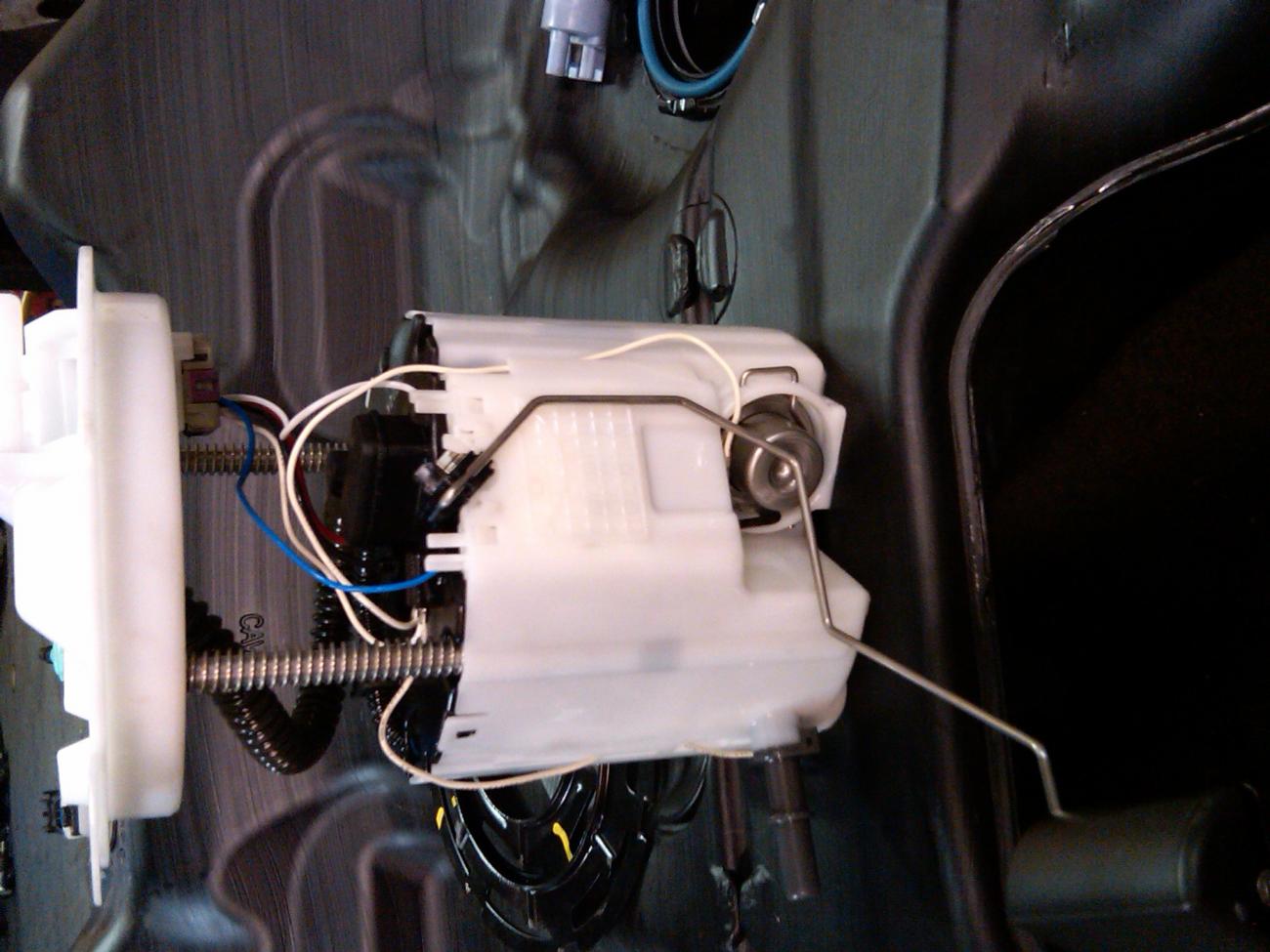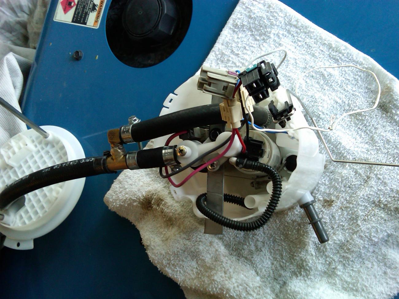 Here are pics of the stock pump assembly and modified. This was a temp mod. It is a lot cleaner now that we know it works. You have to keep the stock pump in there and I used a pump out of a GT40 super car because they are pulse width modulated pumps and supplie alot of fuel.