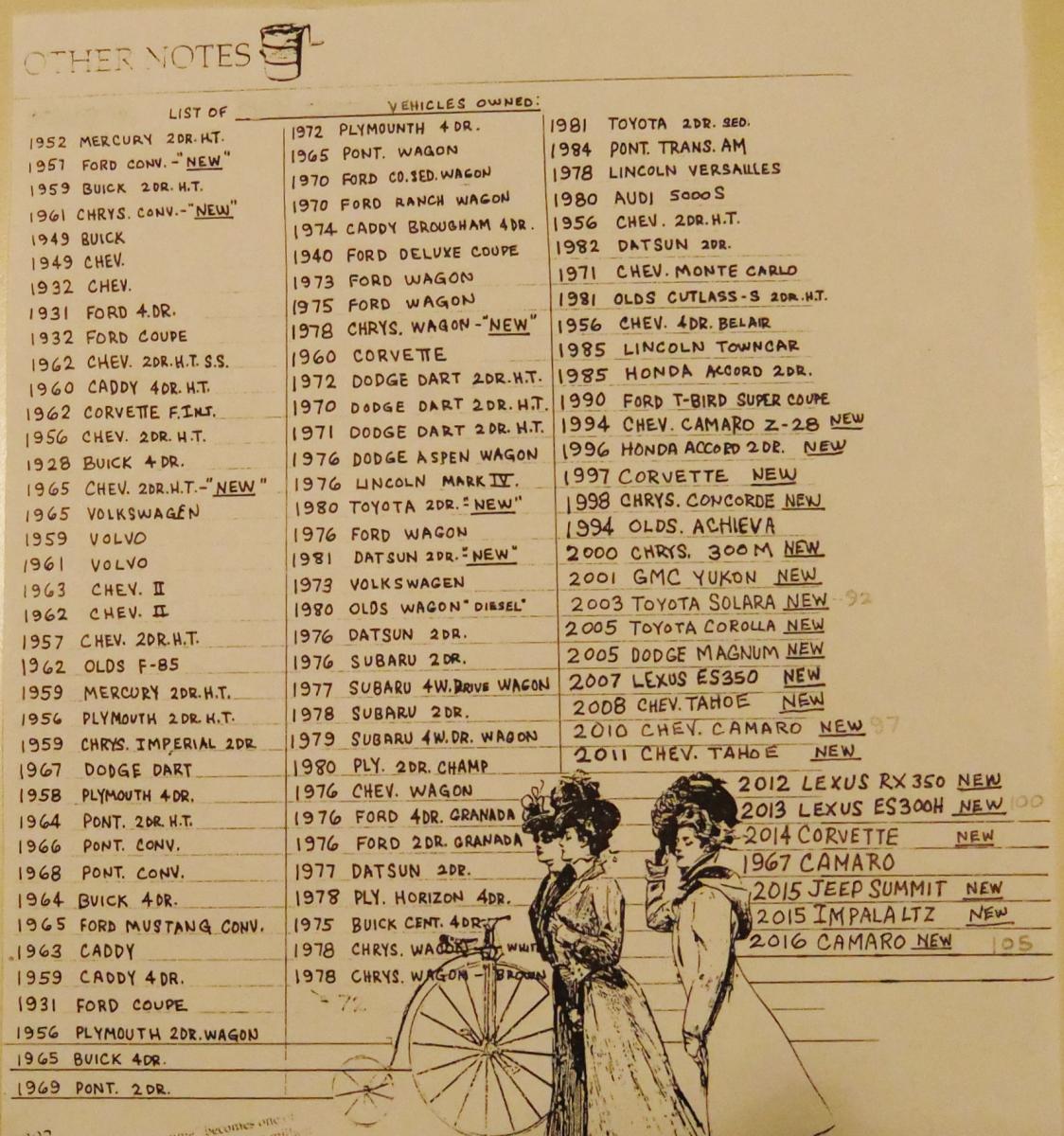 1964 Corvair 1967 Ford Fairlane 1973 Ford Pinto 1966 Ford Fairlane 1964 Malibu SS Convertible 1972 Chevy Nova 1993 Ford Festiva 1997 Malibu 2003 Impala 2008 Malibu 2011 2SS/RS Camaro convertible 2013 Camaro ZL1 convertible 2015 Malibu |