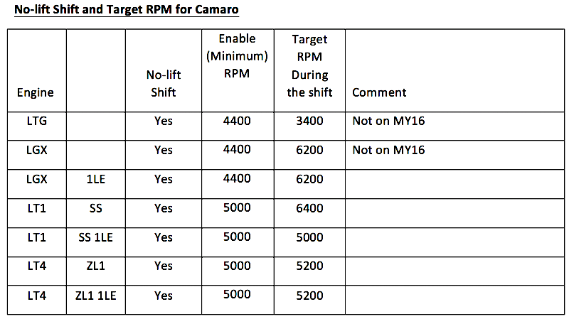 I would like to address a few of the specific comments with regard to No-lift Shifting. As I mentioned, the feature is on all 6th Generation Camaro Manual Transmissions, with the exception of the 2016 2.0T and V6. Those were added in Model Year 2017 and beyond. With regard to the effect of Mode selection on No-lift Shift, there is no difference between Tour/Sport/Track/Snow-Ice mode or PTM mode on the ability to perform the quick shifts. Most people either don’t keep the throttle to the floor, or don’t wait until they reach their Enable RPM before performing their shift. Both are required criteria to execute the No-lift shift feature. Lastly, the Enable and Target RPM is different for each engine application, and even within an application (as in the SS and SS 1LE).