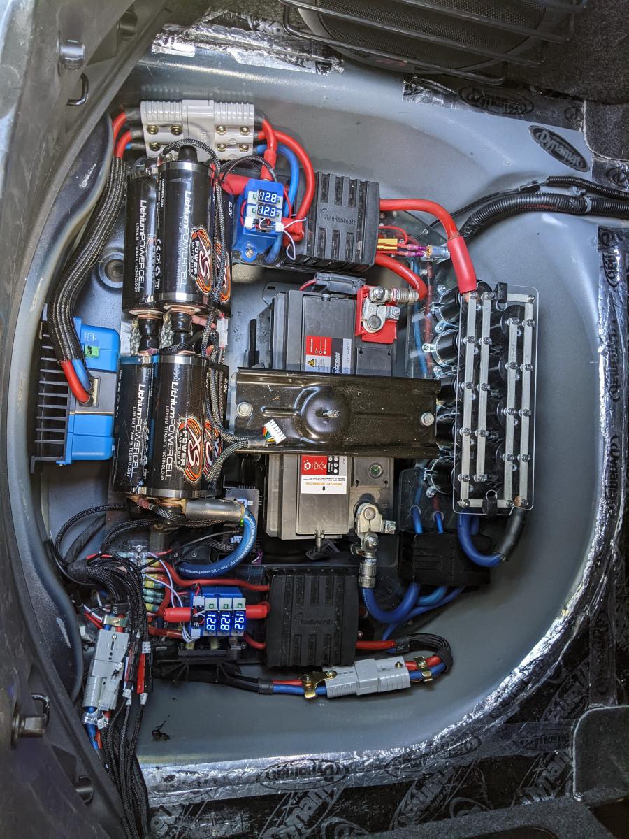 Photos are of Plex Media Player and Waze split-screen view - Plex Media Player album view - Plex Media Player libary view - Waze full screen - SxxTxxxx Amp rack with cover off and Zotac ZBOXNANO-ID68-U PC & Alpine DSP PXA-H800 & DSP PDX-V9 amplifier - SxxTxxxx box and Alpine SWS-10D4 sub-woofer - SPS-610CG 2-way components mounted in parcel tray (tweeter in C-pillar) & cross-overs & LTE modem with omni-directional quad antenna, and rear seat pass-though is retained (SPS-610CG 2-way components are also mounted in doors, with all speaker routing using OFC cable) - power supply and audio system is autonomous from starting battery, "real" 0.47F capacitor array, Victron 360W DC-DC charger from engine alternator to 40AH LTO battery array, DCDCNUC 19V power supply, TDK DC contactors, KnuKonceptz cable & fuse/distribution blocks.