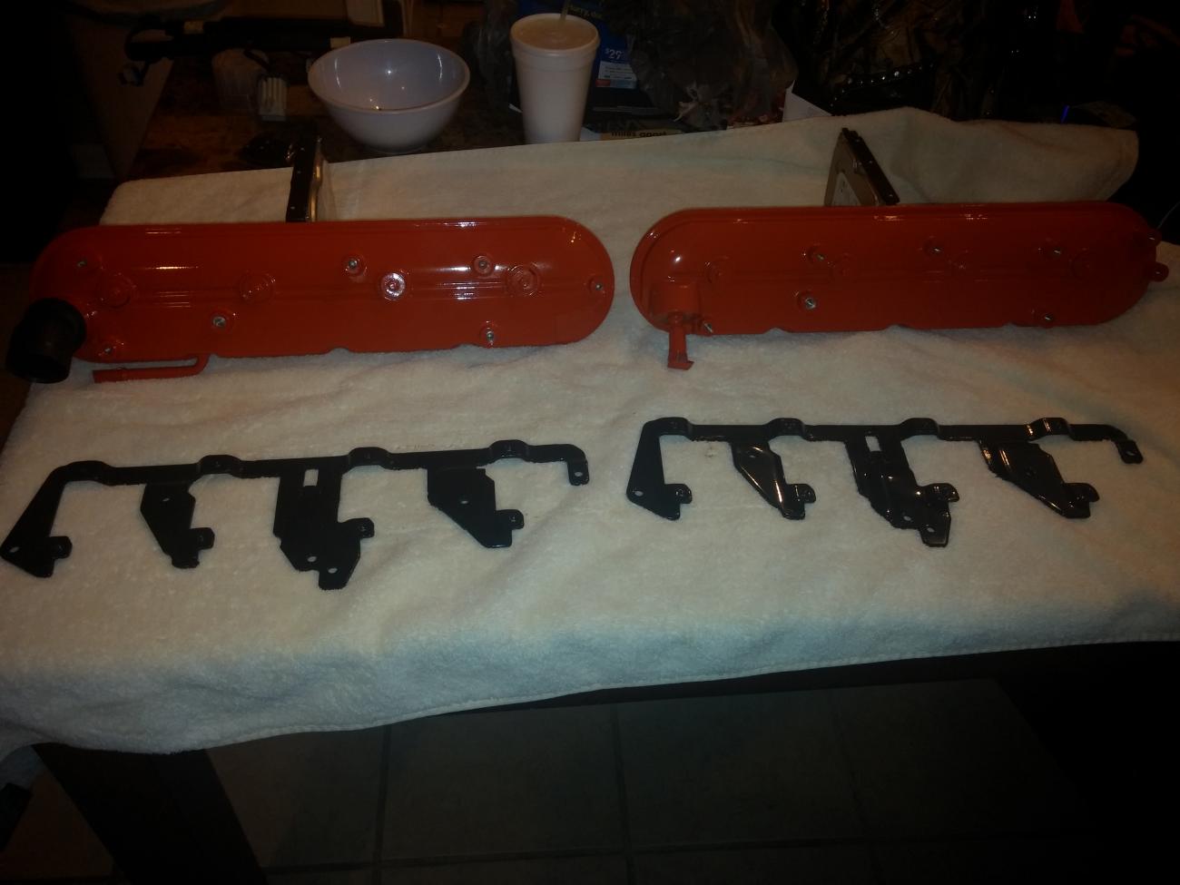 Greg wasn't available last night and I got anxious, lol, so I painted the valve covers and coil brackets last night. I went with orange covers and black brackets. I think it looks pretty good! Painting the coil packs sometime this week.