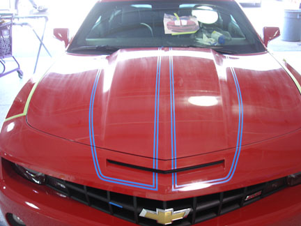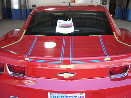 Here is the outline of my stripes. I was freaking when I saw the swirls in the paint, however he said they take a brilo pad over the paint so the new paint and the clear coat sticks. It better shine nice after it's all done. He said it would be ready late Friday. I'll add Photo's when I have them.