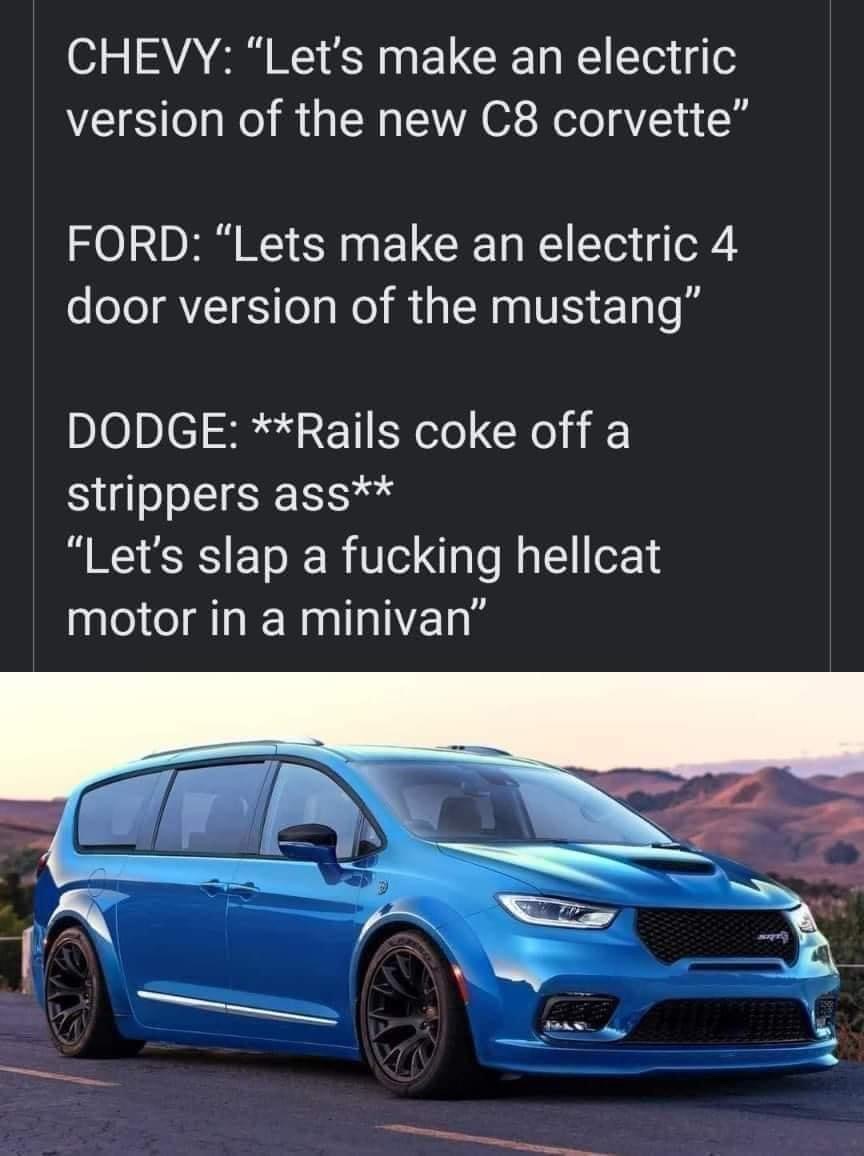 Hellcat Minivan- they also put a V10 on a “motorcycle”. The Tomahawk. https://en.wikipedia.org/wiki/Dodge_Tomahawk ![]() Sent from my iPhone using Tapatalk |