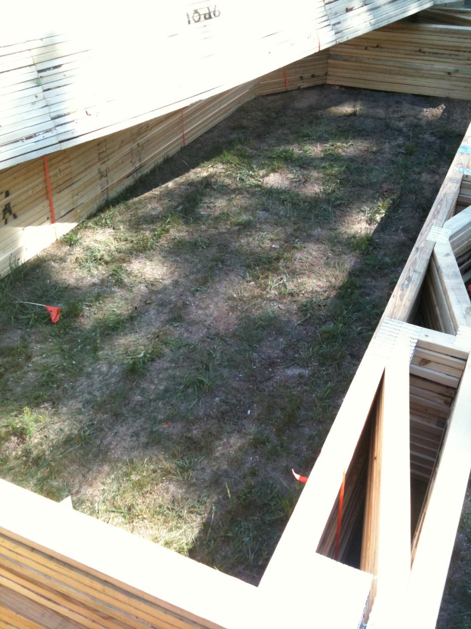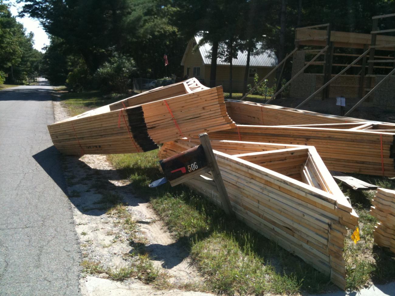 As you can see the truck dropped them a little off of the mark, but we were able to get them stacked back into place. Now we just need to wait until we can rent a skytrack and get enough hands to help us put them up.