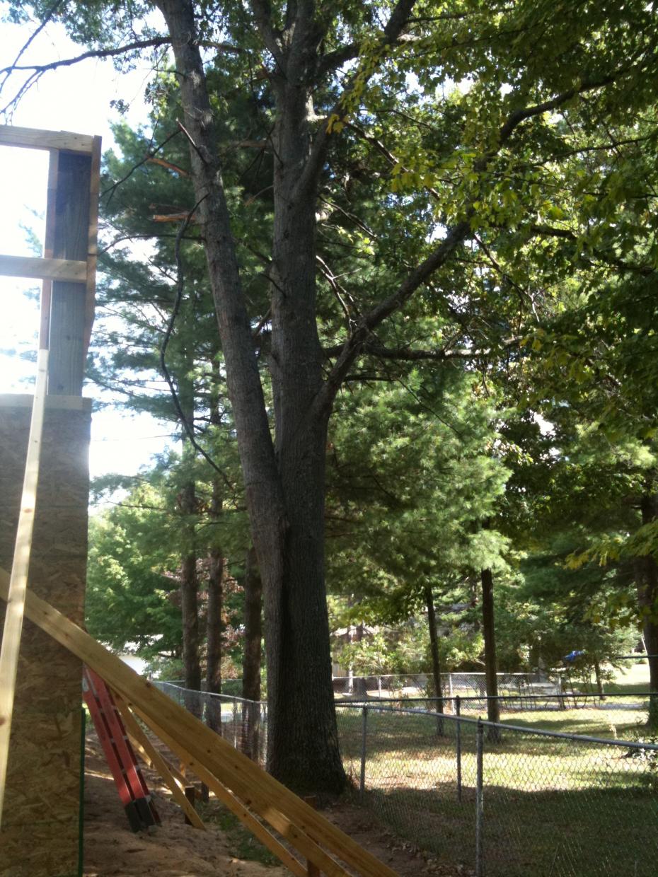 Well... after further inspection and seeing how TALL my place is actually going to be, we decided that this tree neeeeeds to come down. WELL... now my building is 8ft from it and already 12ft in the air. So it was a project that we could no longer handle. We had a local guy come out and bid to take it down. It was definitely sticker shock when I heard the number... but I think it was a fair price and had to be done.