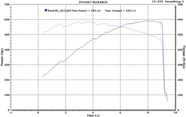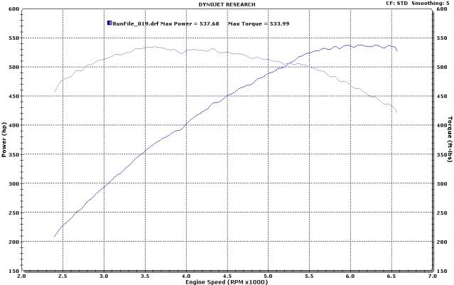 The addition of the American Racing Headers to our TVS system exceeded our expectations! With a makeshift air filter set-up and AR headers at 7.5lbs of boost we witnessed a 77hp jump at the rear wheels resulting in 569rwhp. This translates to a bhp jump from 576 to 667 and brings torque to 641ft/lbs! For future reference, we then decided to make a power pull with 10lbs of boost. As you can see from the dynograph below, horsepower jumped to 591 at the rear wheels (695 at the crank)! ![]() MTI Racing TVS system with American Racing 1 7/8" headers @ 7.5lbs of boost. ![]() MTI Racing TVS system with American Racing 1 7/8" headers @ 10lbs of boost. We can't wait to see the power gains of additional complimentary components such as a Cold Air Intake, cat-back system, camshaft, themostat, etc. |