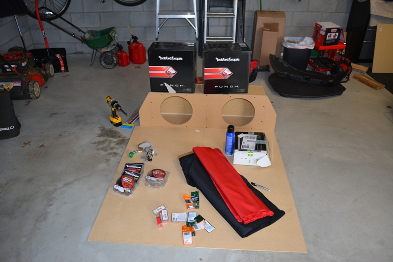 Here's a picture of most the supplies I had for this. UPS was a little delayed in getting me the second amp and amp wiring kits, which in retrosepect was fine because this took me several days to complete anyway. I found the maker of the subwoofer box online checking out custom sound systems. It is solidly made by "Customboxman" and he's local to me so I went and picked it up. It fits perfectly for a rear facing subwoofer set-up.