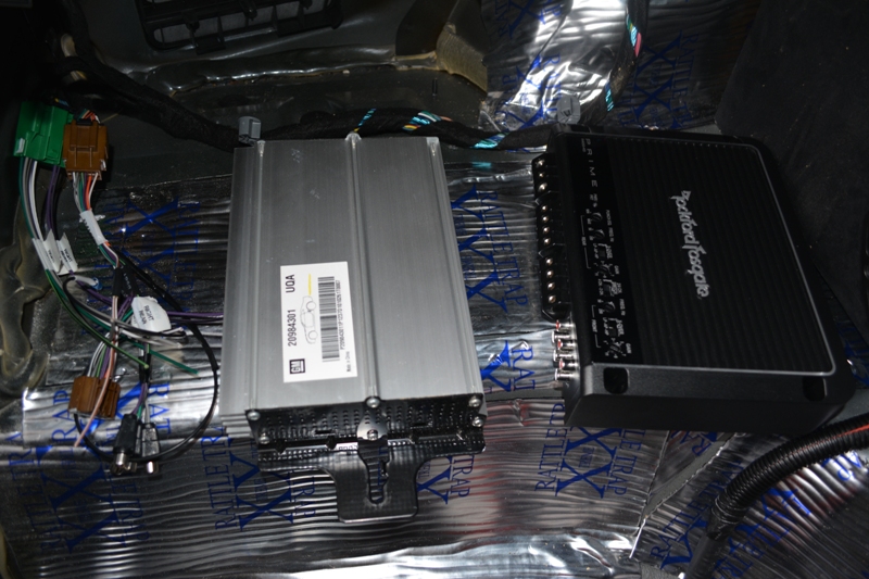 Here's a good side by side shot of the factory amp and the 4 channel amp with the FARK harness. By the way, if you're replacing the factory amp, get the FARK! It was by far the easiest part of the whole process. Just replacing the factory amp had humungous gains in the overall sound quality.