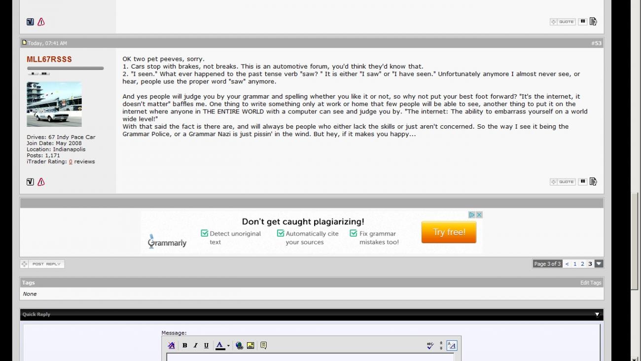 1. Cars stop with brakes, not breaks. This is an automotive forum, you'd think they'd know that. 2. "I seen." What ever happened to the past tense verb "saw? " It is either "I saw" or "I have seen." Unfortunately anymore I almost never see, or hear, people use the proper word "saw" anymore. And yes people will judge you by your grammar and spelling whether you like it or not, so why not put your best foot forward? "It's the internet, it doesn't matter" baffles me. One thing to write something only at work or home that few people will be able to see, another thing to put it on the internet where anyone in THE ENTIRE WORLD with a computer can see and judge you by. "The internet: The ability to embarrass yourself on a world wide level!" With that said the fact is there are, and will always be people who either lack the skills or just aren't concerned. So the way I see it being the Grammar Police, or a Grammar Nazi is just pissin' in the wind. But hey, if it makes you happy... |