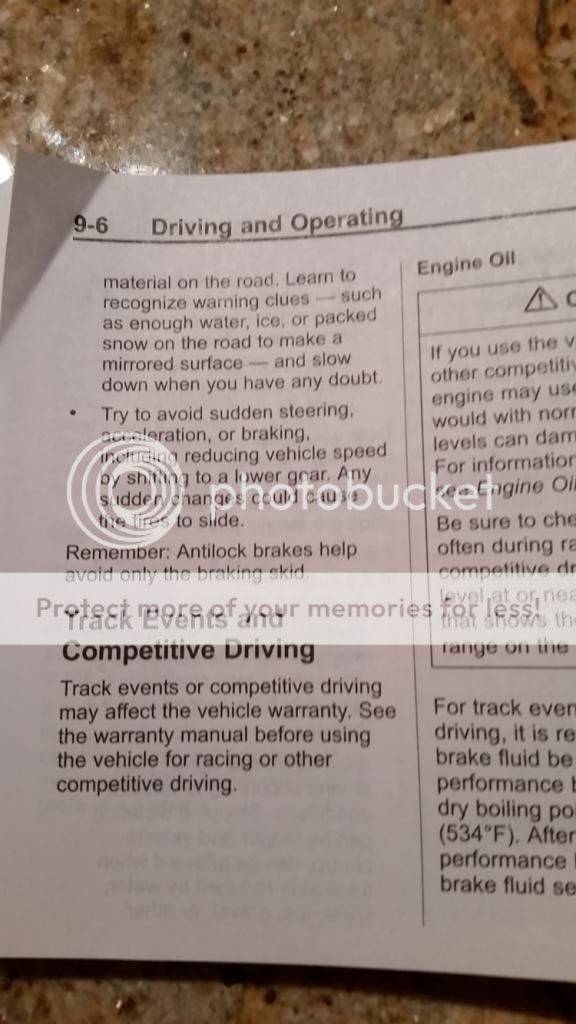 http://www.chevrolet.com/content/dam...wm2ndprint.pdf Please read page 10. This is all that matters as this is the warranty manual itself. Not the owners manual, not a salesman, not an engineer. There are no specific clauses or addendums for the Z/28 or ZL1 either. The warranty does not cover damage due to "misuse of the vehicle due to driving over curbs, overloading, racing, or other competition use." In plain English. However, I'm certain the dealers have the latitude to be generous on certain models if they choose. Which I hope is the case for OP.